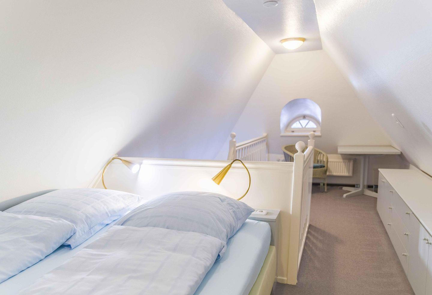 1 Doppelschlafzimmer auf der offenen Empore (Treppe abgehend vom Wohnbereich).