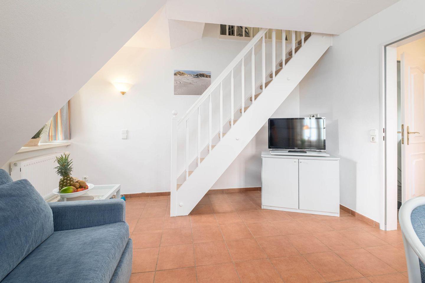 Wohn-/ Esszimmer mit Schlafcouch für 1 Person, Küche, Duschbad/ WC, 1 Schlafzimmer für 2 Personen mit Einzelbetten auf der offenen Empore.