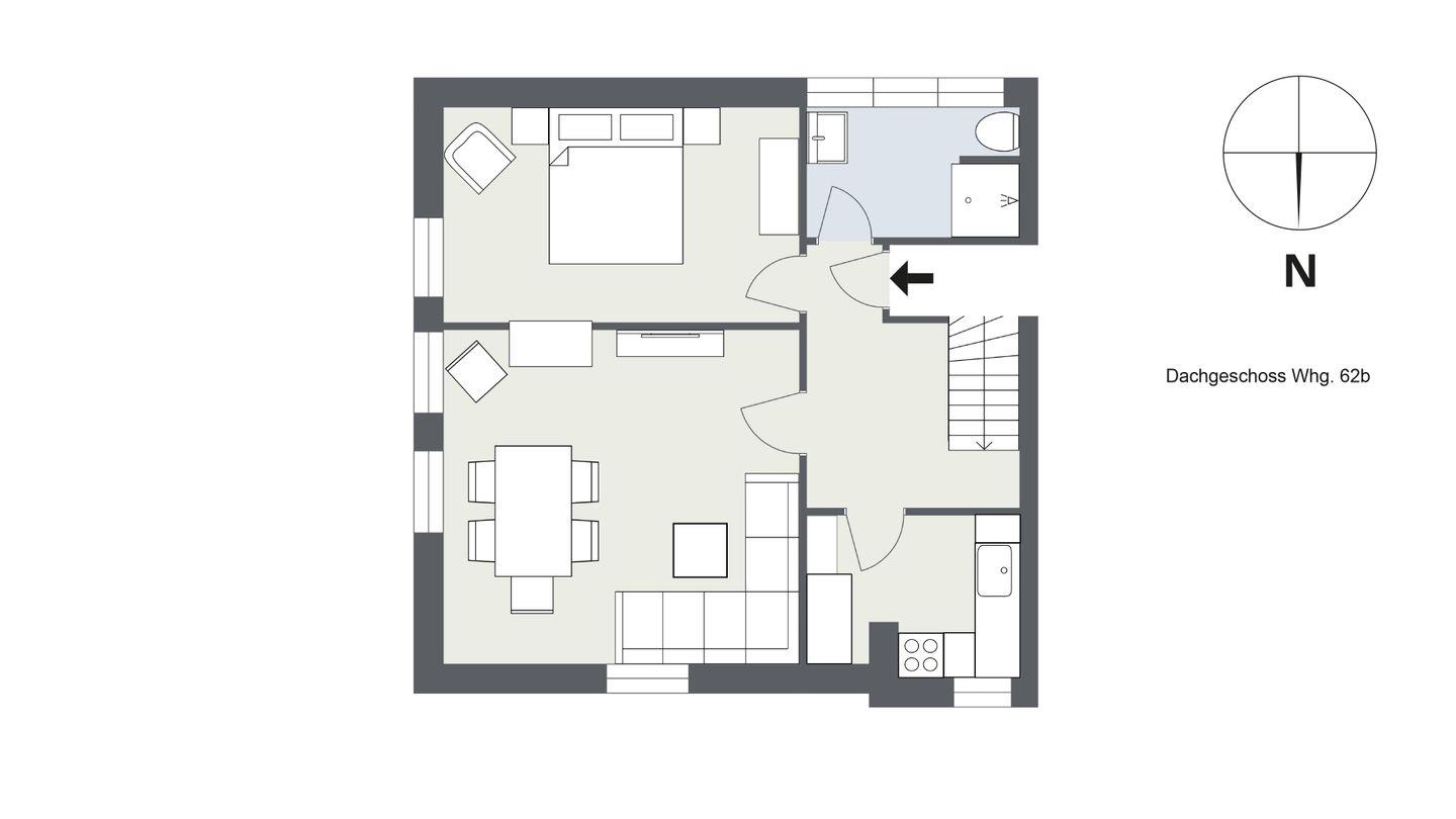 Wohn-/Esszimmer, Küche, Duschbad/WC, 1 Doppelschlafzimmer sowie 1 Doppelschlafzimmer im Dachgeschoss.