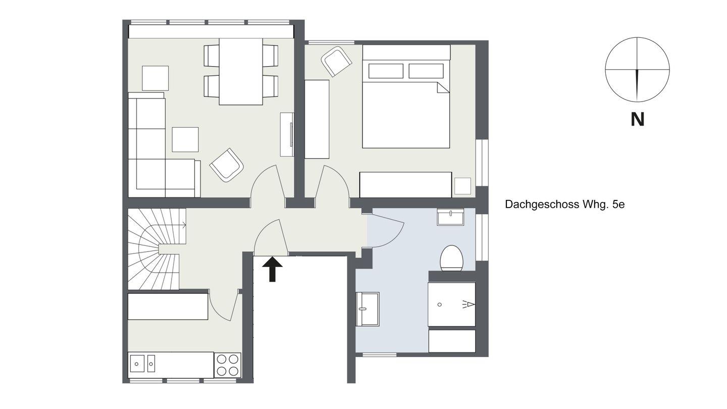 Wohn-/ Esszimmer, Ku¨che, 1 Duschbad/ WC, 1 Doppelschlafzimmer,