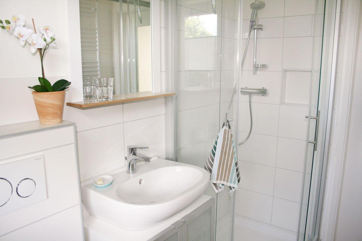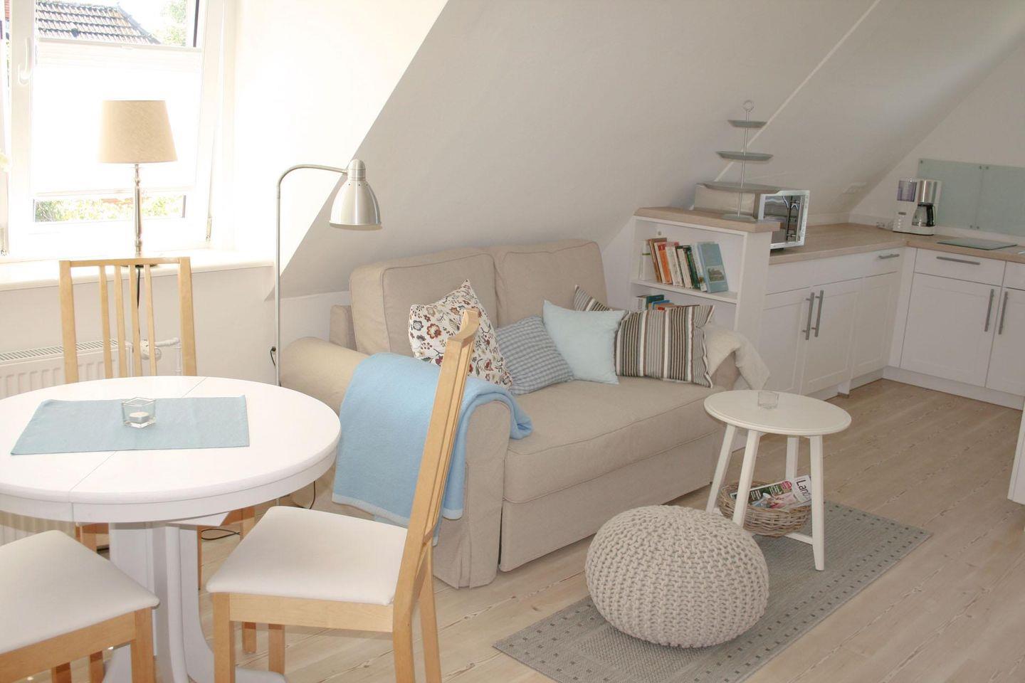 Modern und hell eingerichtet ist die Ferienwohnung ideal für 2-3 Personen. Der Wohnbereich der Ferienwohnung bietet Ihnen Komfort mit einem Schlafsofa, einer kleinen Bibliothek und Smart TV mit Internet-Zugang sowie kostenlosem W-LAN für Sie. Der Küchenbereich ist voll ausgestattet. Eine Treppe führt hoch in den zweiten Stock zum Schlafzimmer mit Doppelbett und Kleiderschrank. Hier finden Sie auch eine Yogamatte ein Yoga-Sitzkissen. Neben dem Küchenbereich befindet sich das Bad.