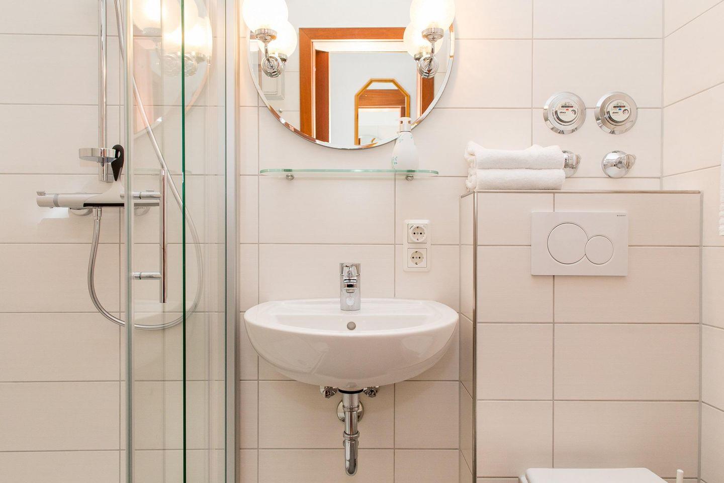 Das Badezimmer ist mit einer Dusche, einem WC und einen Waschbecken mit Spiegel ausgestattet.