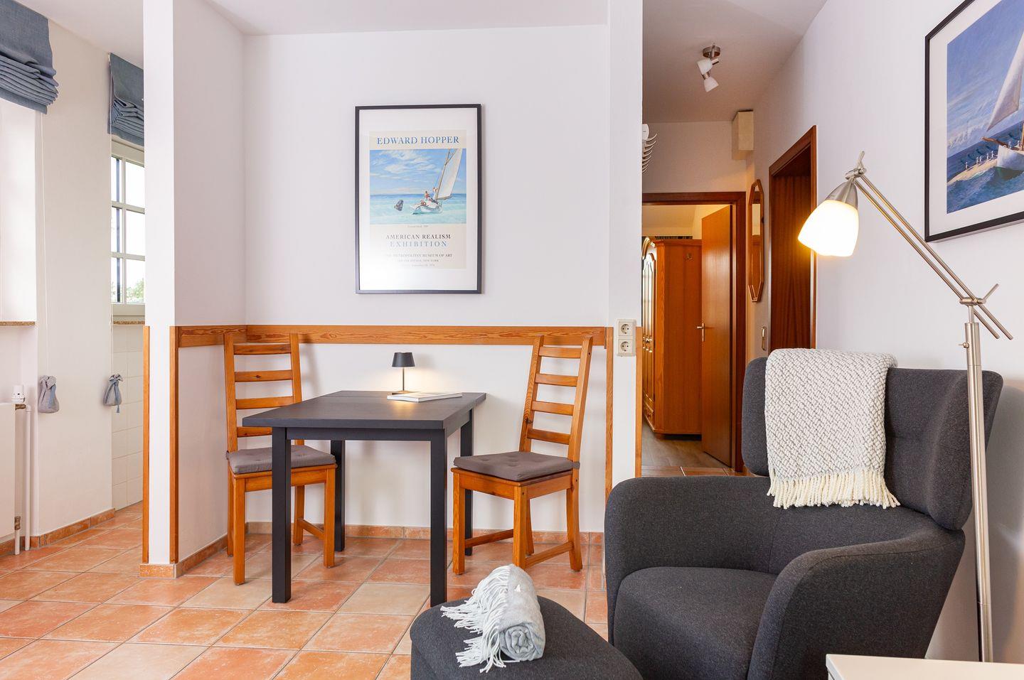 Das Wohnzimmer ist mit zwei Sesseln mit Ablagen, einem Essplatz und einem TV eingerichtet.