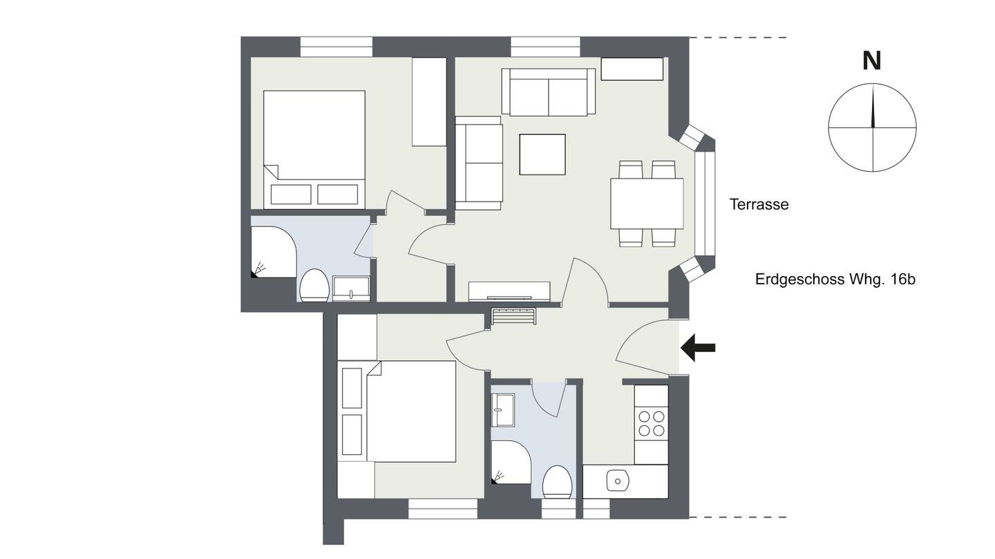 Wohn-/Esszimmer, Küche, 2 Duschbäder/ WC, 2 Doppelschlafzimmer