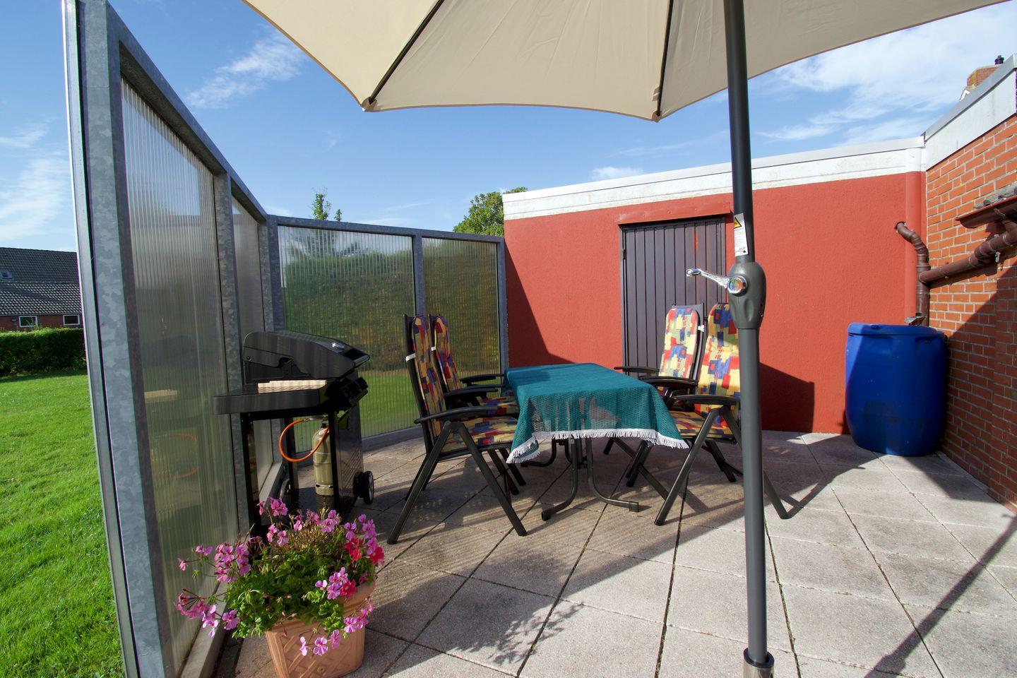 Ihre windgeschützte Terrasse mit hochwertigen Gartenmöbeln, Sonnenschirm und einem Gasgrill lädt Sie zu gemütlichen Grillabenden ein.