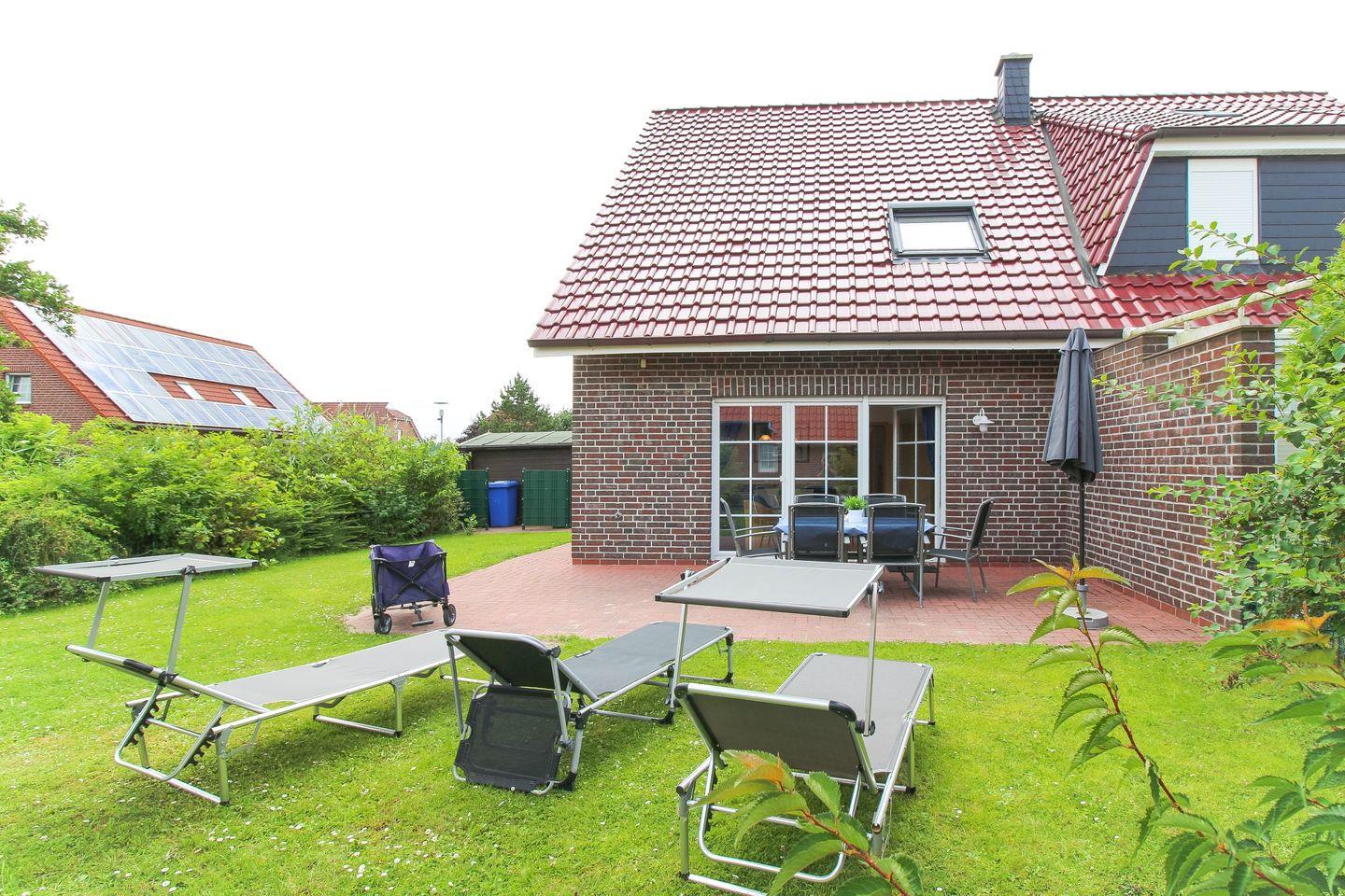 Der großzügige Garten mit möblierter Terrasse lädt zum Entspannen ein. Stühle mit großem Tisch, Sonnenliegen, ein Sonnenschirm und ein kleines Gartenstück stehen zur Verfügung. Für Ausflüge mit Kindern ist auch ein Bollerwagen vorhanden. Zwei Pkw-Einstellplätze befinden sich direkt vor der Haustür – bequem und praktisch.