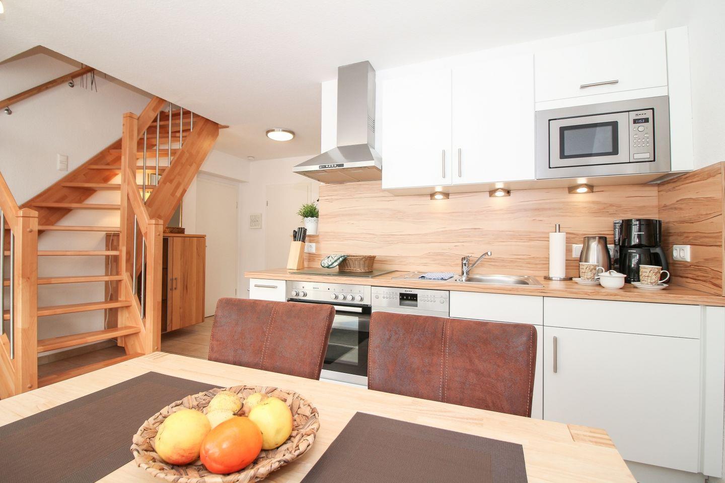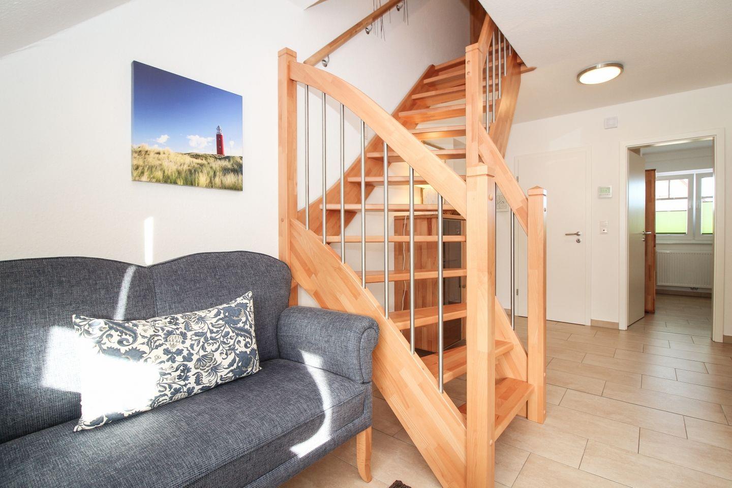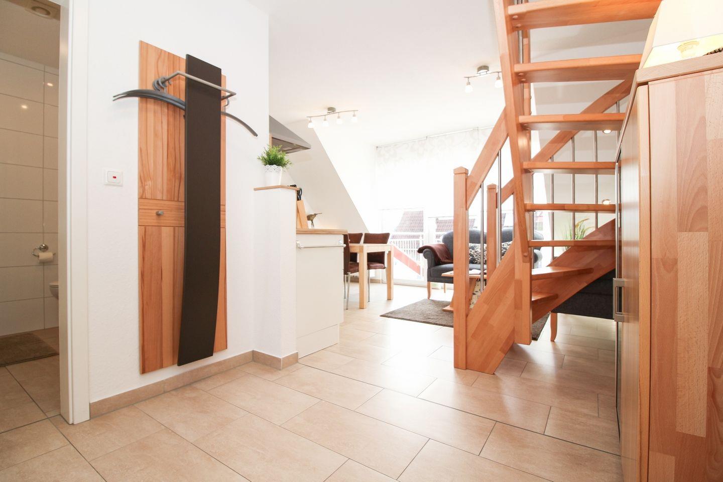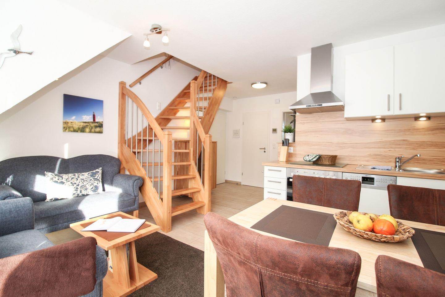 Die Unterkunft erstreckt sich über zwei Etagen und befindet sich im ersten Stock. Die bodentief gefliesten Wohn- und Schlafräume sorgen für ein gepflegtes und sauberes Ambiente. Das Wohnzimmer überzeugt mit einer gemütlichen Sofaecke, Sessel sowie modernen Unterhaltungsmedien wie TV, Blu-ray-Player, CD-Player und Radio. Für gesellige Abende stehen Ihnen zudem eine Auswahl an Spielen und Büchern zur Verfügung. Ein Esstisch bietet ausreichend Platz für gemeinsame Mahlzeiten.