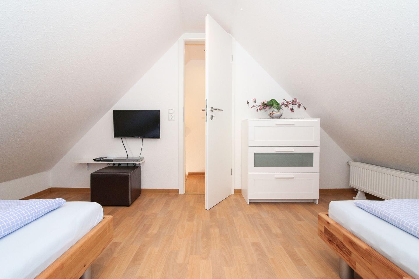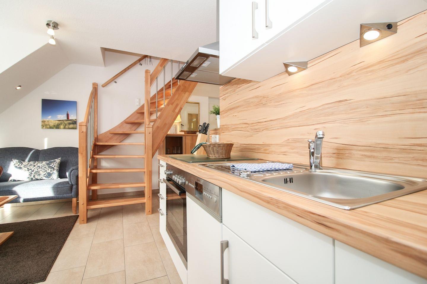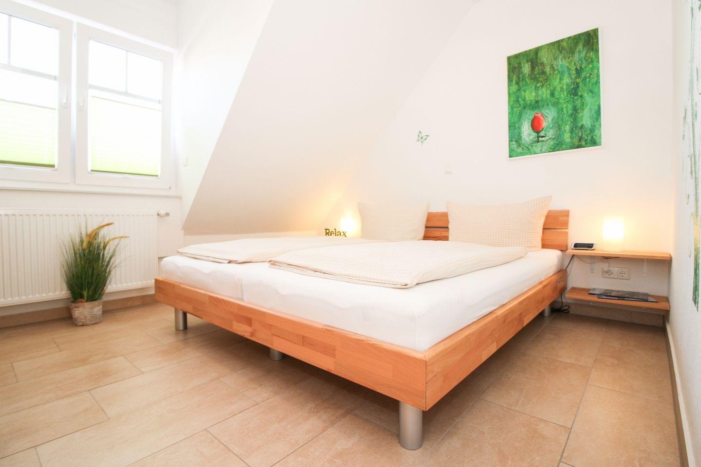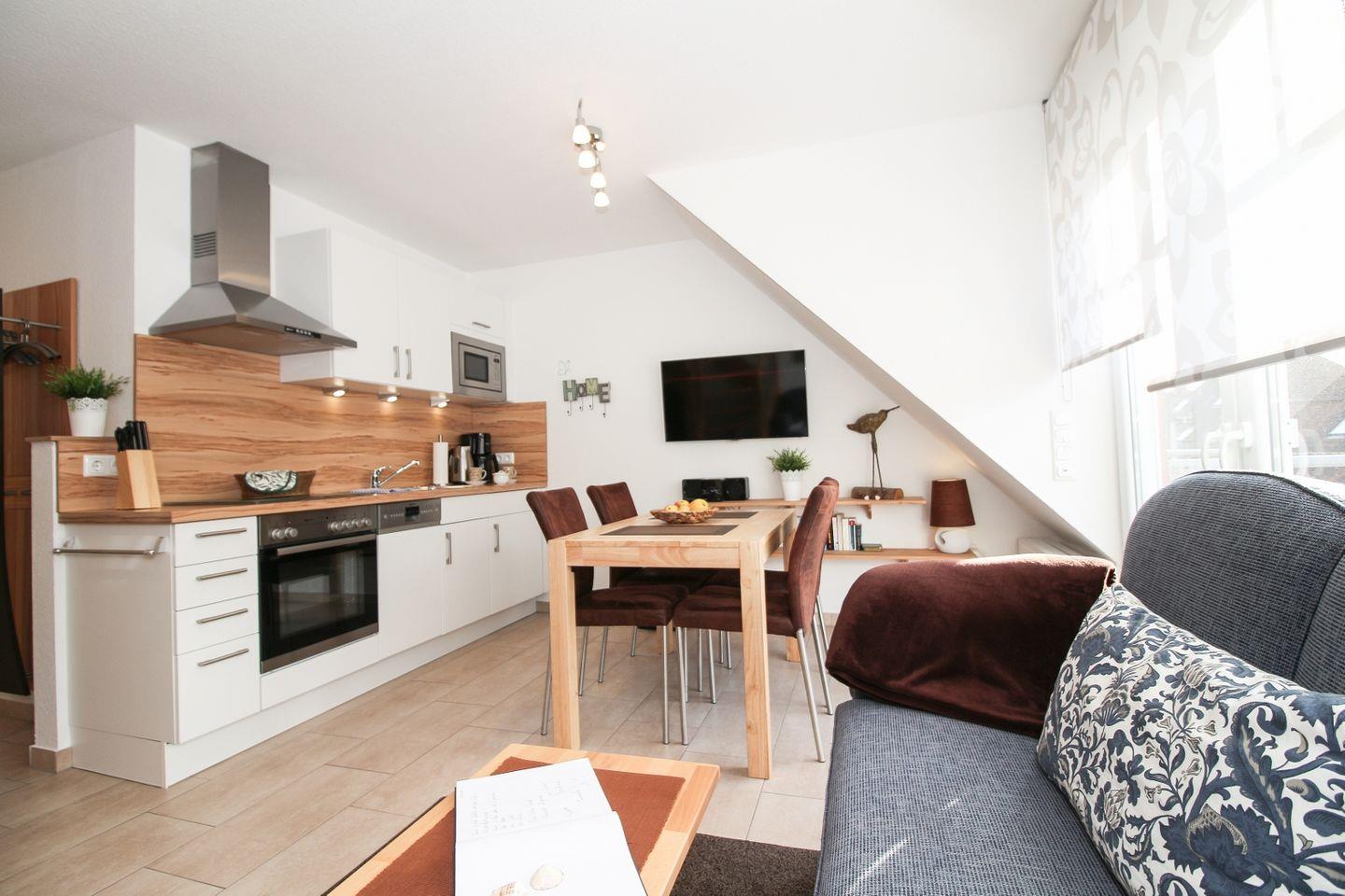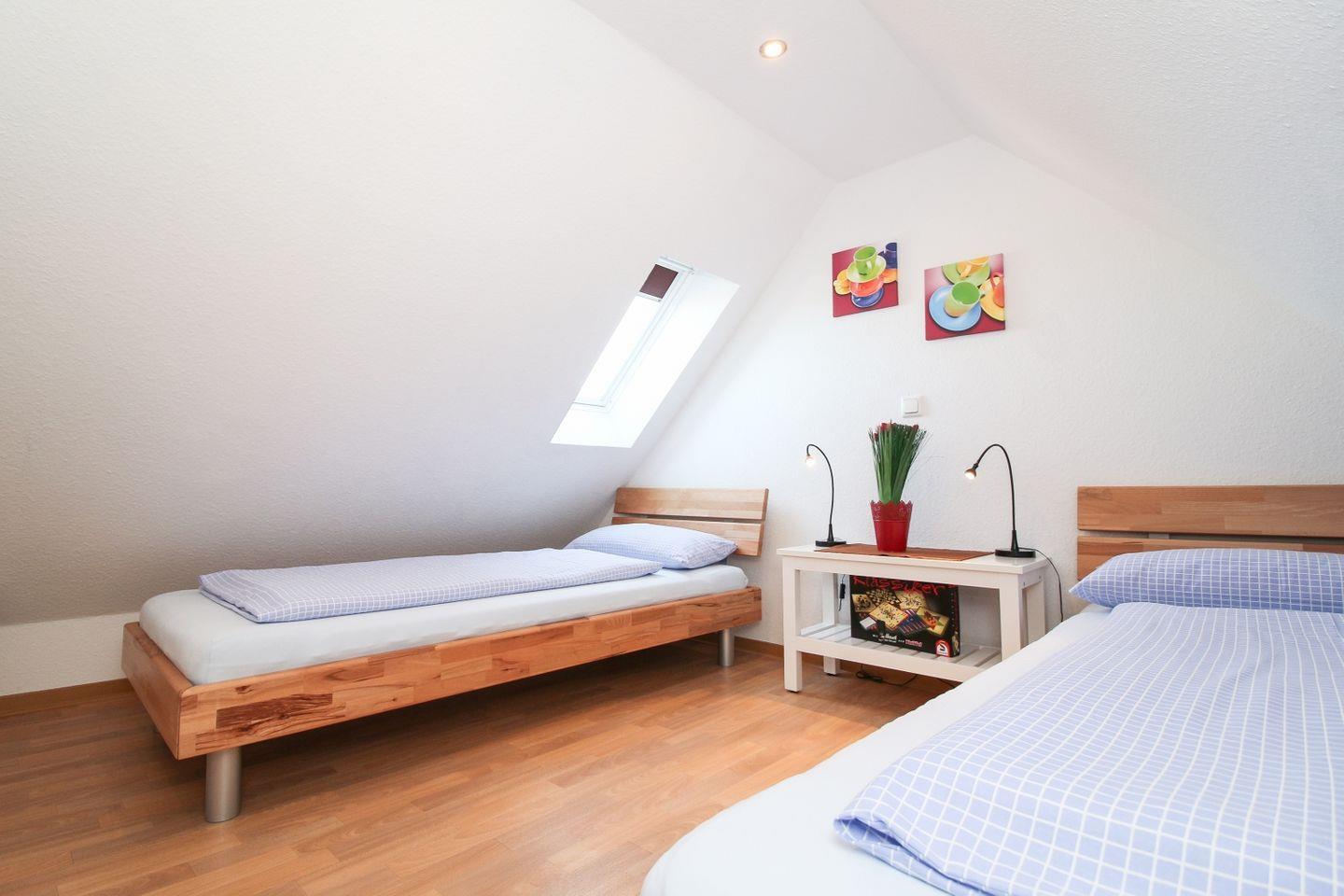 Die Unterkunft erstreckt sich über zwei Etagen und befindet sich im ersten Stock. Die bodentief gefliesten Wohn- und Schlafräume sorgen für ein gepflegtes und sauberes Ambiente. Das Wohnzimmer überzeugt mit einer gemütlichen Sofaecke, Sessel sowie modernen Unterhaltungsmedien wie TV, Blu-ray-Player, CD-Player und Radio. Für gesellige Abende stehen Ihnen zudem eine Auswahl an Spielen und Büchern zur Verfügung. Ein Esstisch bietet ausreichend Platz für gemeinsame Mahlzeiten.