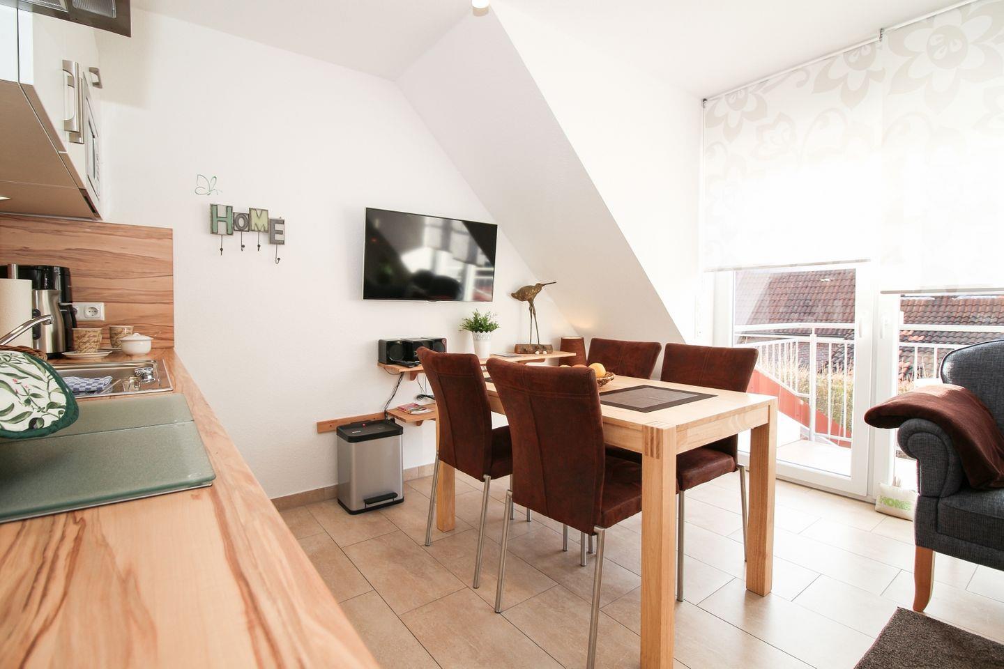 Ein besonderes Highlight der Austernperle ist der Balkon, der mit Gartenmöbeln und Sonnenschirm ausgestattet ist – ideal, um den Tag bei frischer Nordseeluft entspannt ausklingen zu lassen. Hier können Sie nach den Aktivitäten des Tages verweilen und die Atmosphäre Norddeichs genießen.