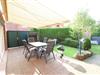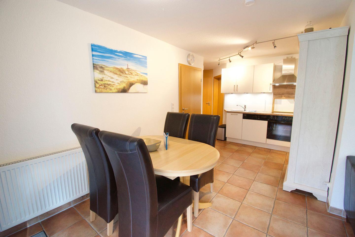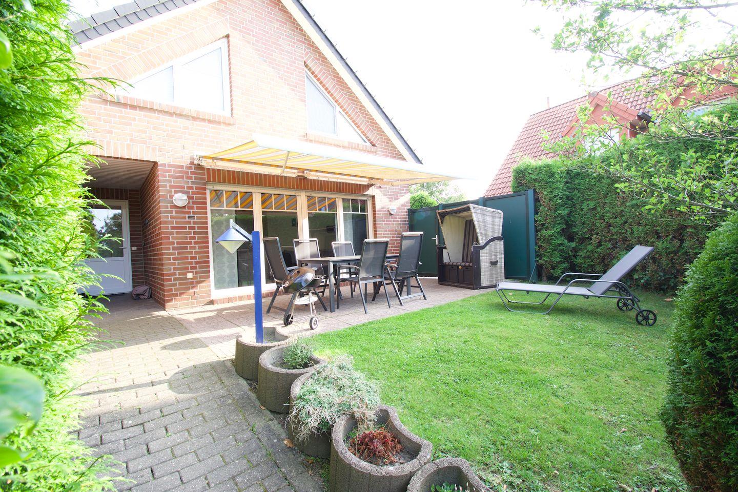 Die Terrasse ist mit einer Markise ausgestattet und verfügt über bequeme Sitzmöglichkeiten, darunter ein Tisch mit sechs Stühlen. Für zusätzlichen Komfort sorgen ein Sonnen- und Sichtschutz sowie ein eigener Strandkorb direkt auf der Terrasse. Ein Grill steht den Gästen ebenfalls kostenlos zur Verfügung.