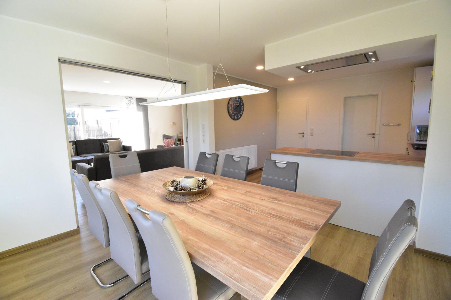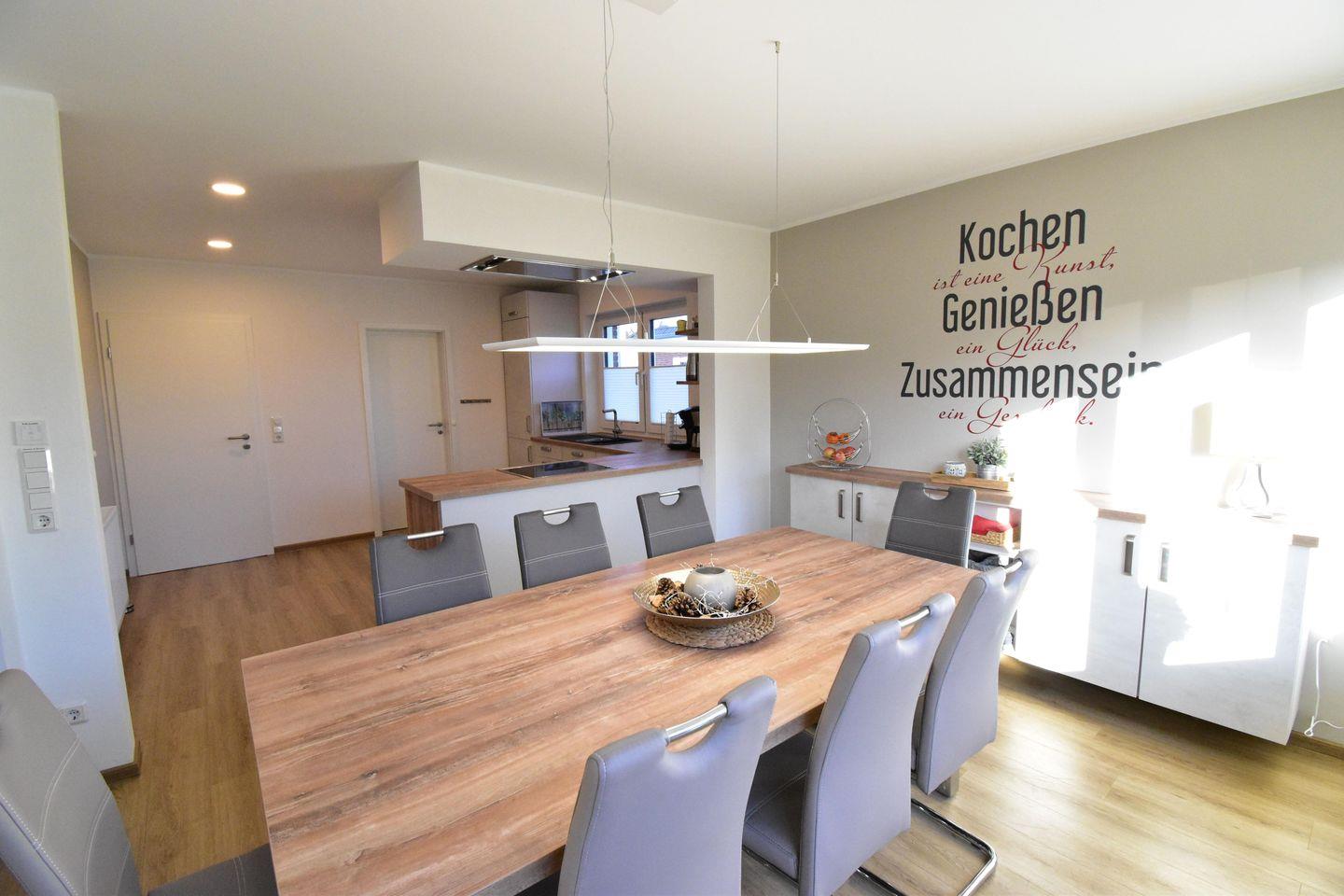 Das Erdgeschoss ist offen und großzügig gestaltet und umfasst eine separate Küche sowie einen angrenzenden Wohnbereich mit Kaminofen. Ergänzt wird das Erdgeschoss durch ein Gästebad, ein großes Badezimmer, eine Garderobe sowie eine großzügige Terrasse, die sowohl vom Wohnbereich als auch vom Schlafzimmer aus zugänglich ist.