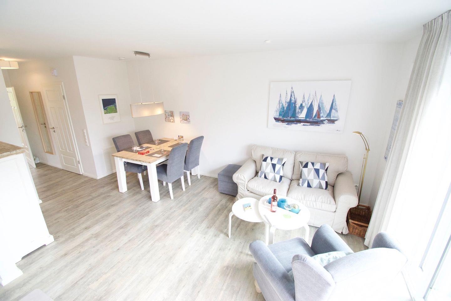 Fühlen Sie sich wohl im lichtdurchfluteten gemütlichen Wohn/ Esszimmer mit Blick auf die Terrasse oder nutzen Sie das separate Wohn-Schlafzimmer auf dem bequemen Schlafsofa oder den Sesseln vor dem TV.