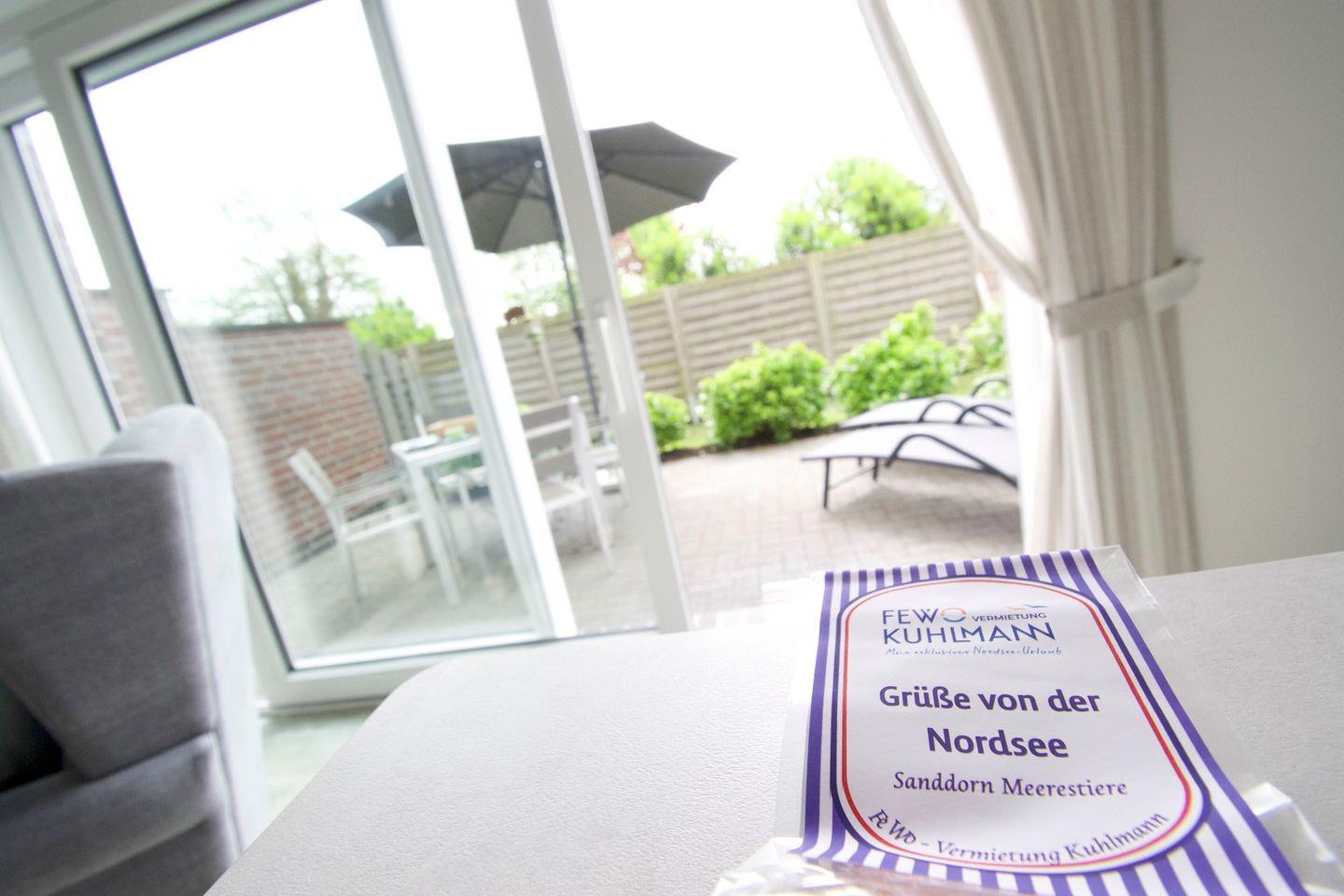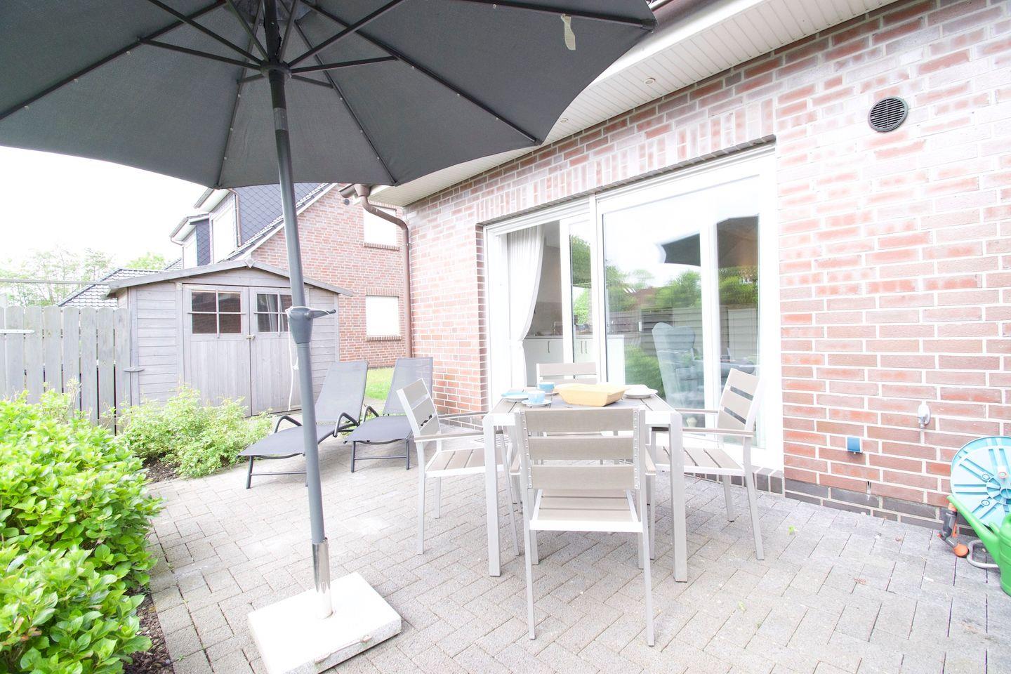 Die großzügige Terrasse mit Gartenmöbeln und Markise schafft ideale Bedingungen für entspannte Stunden im Freien. Zwei kostenfreie Privatparkplätze stehen direkt am Haus zur Verfügung.