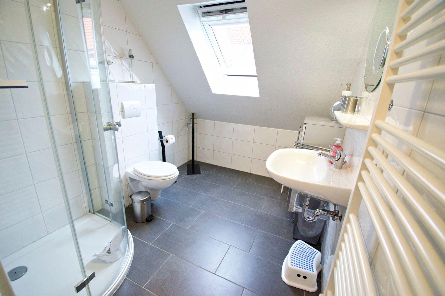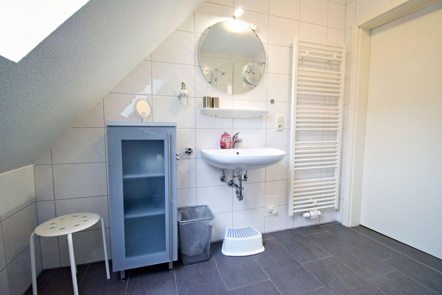 Badezimmer mit bodengleicher Dusche, Fenster, Föhn und Kosmetikspiegel