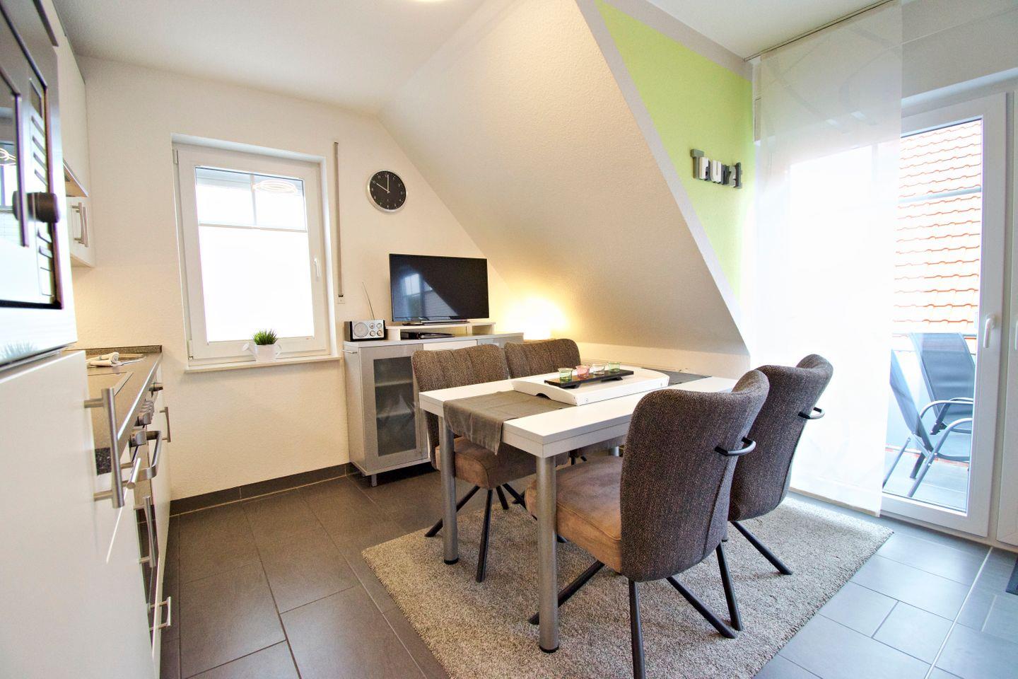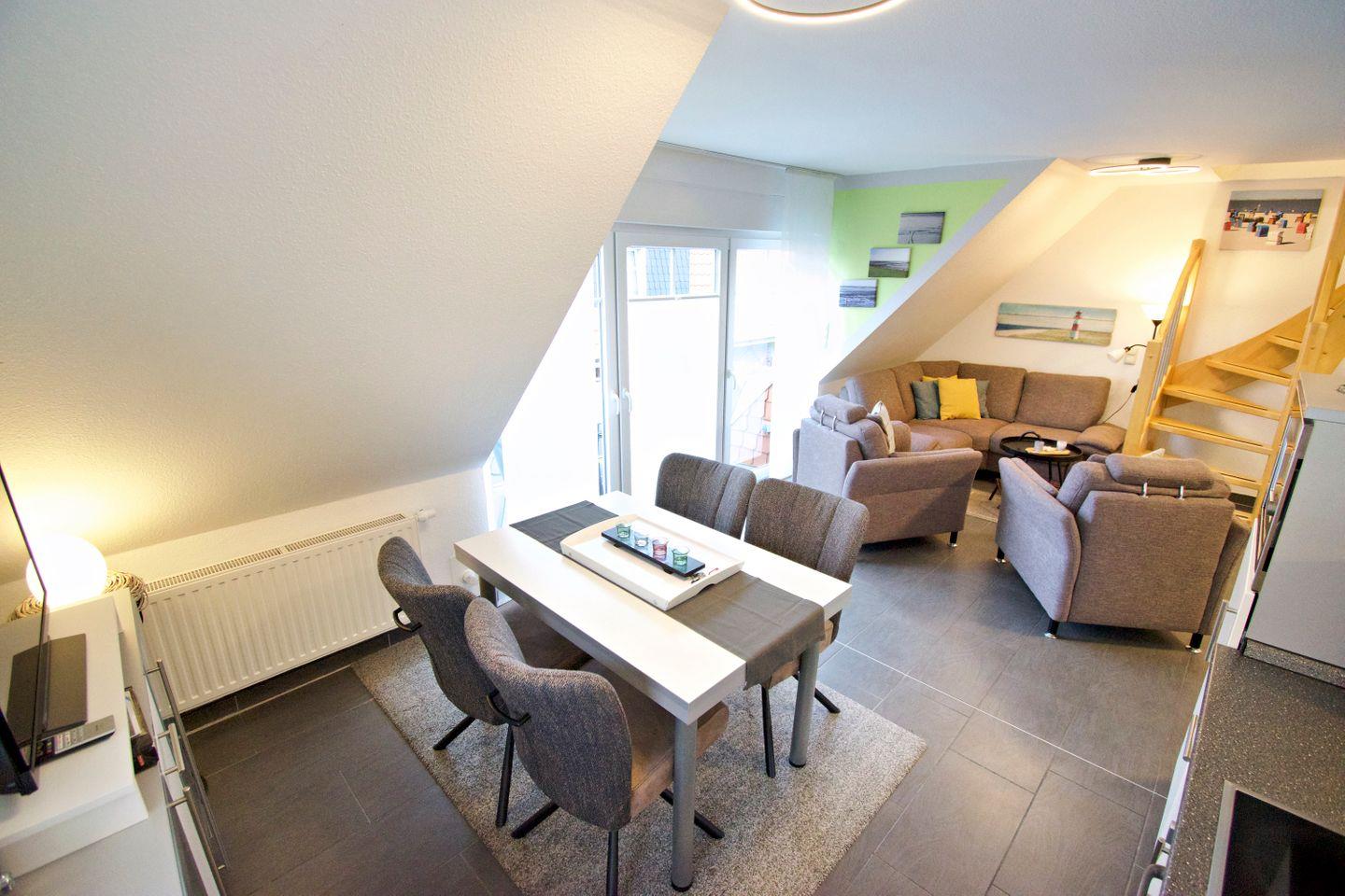 Die Ferienwohnung überzeugt mit einem hellen, offenen Wohn- und Essbereich, einer voll ausgestatteten Küche, zwei gemütlichen Schlafzimmern sowie einem modernen Badezimmer. Ob als Familie, Paar oder Alleinreisende – hier finden Sie alles, was Sie für einen entspannten Urlaub an der Nordsee benötigen.