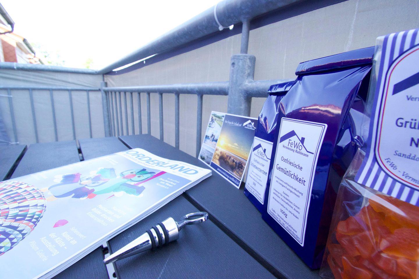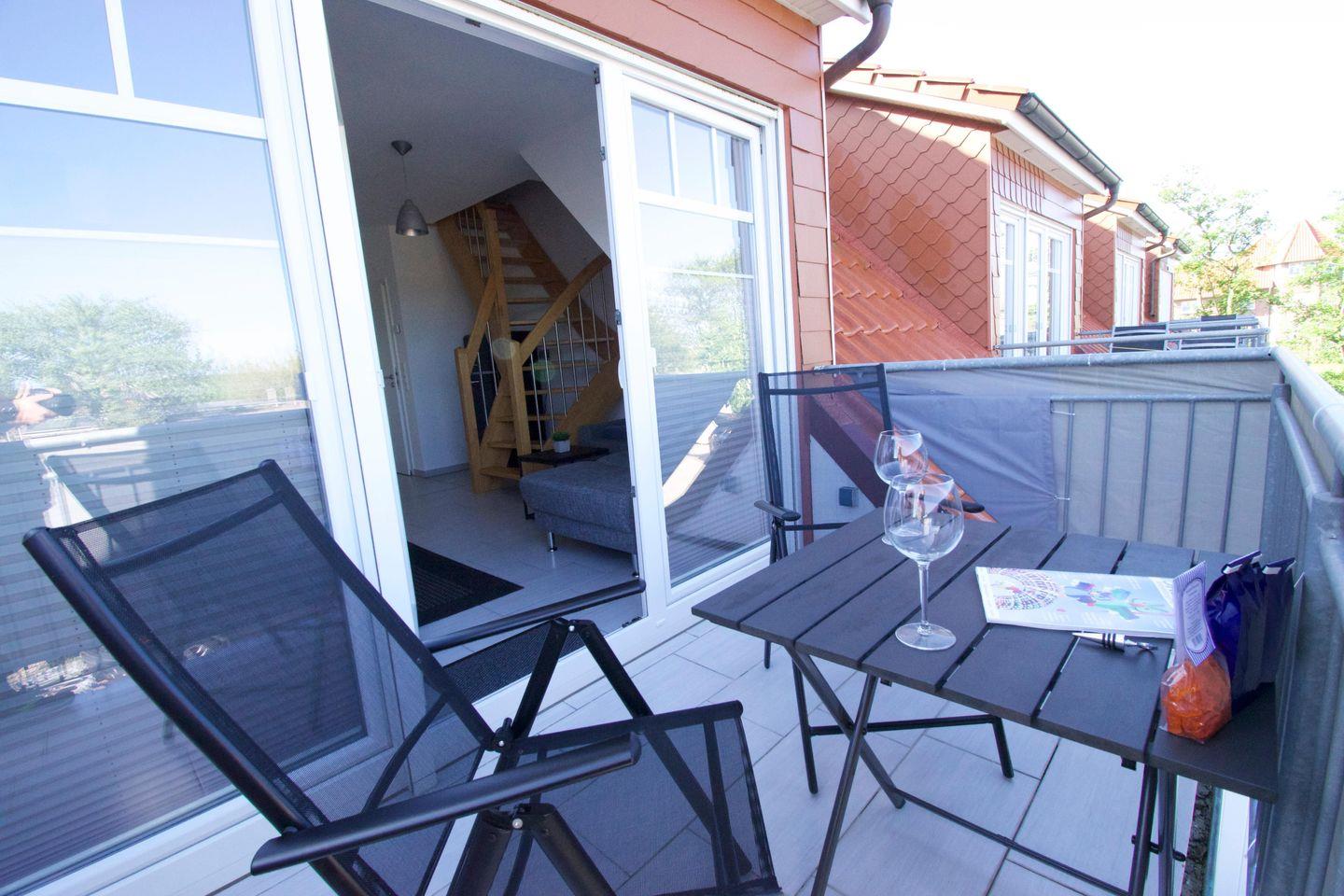 Ein kleiner Balkon mit Tisch und Stühlen lädt zum Verweilen ein. Haben Sie ein gutes Buch dabei?