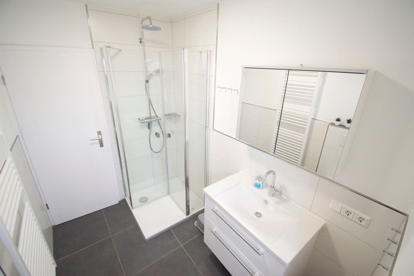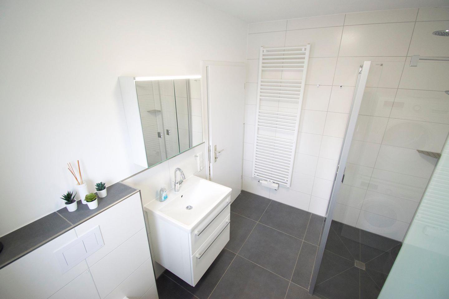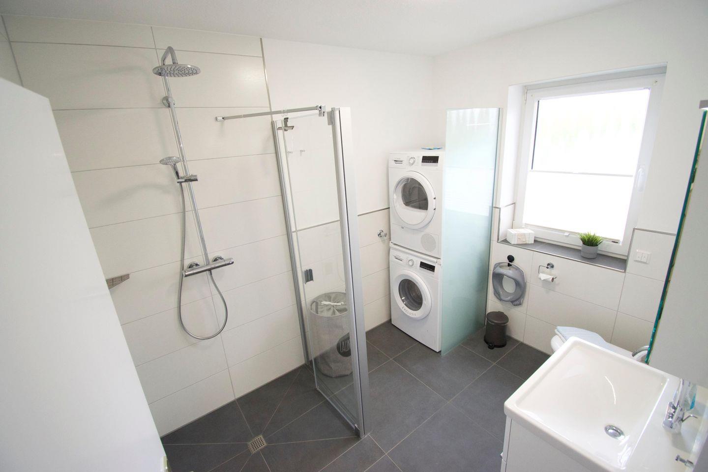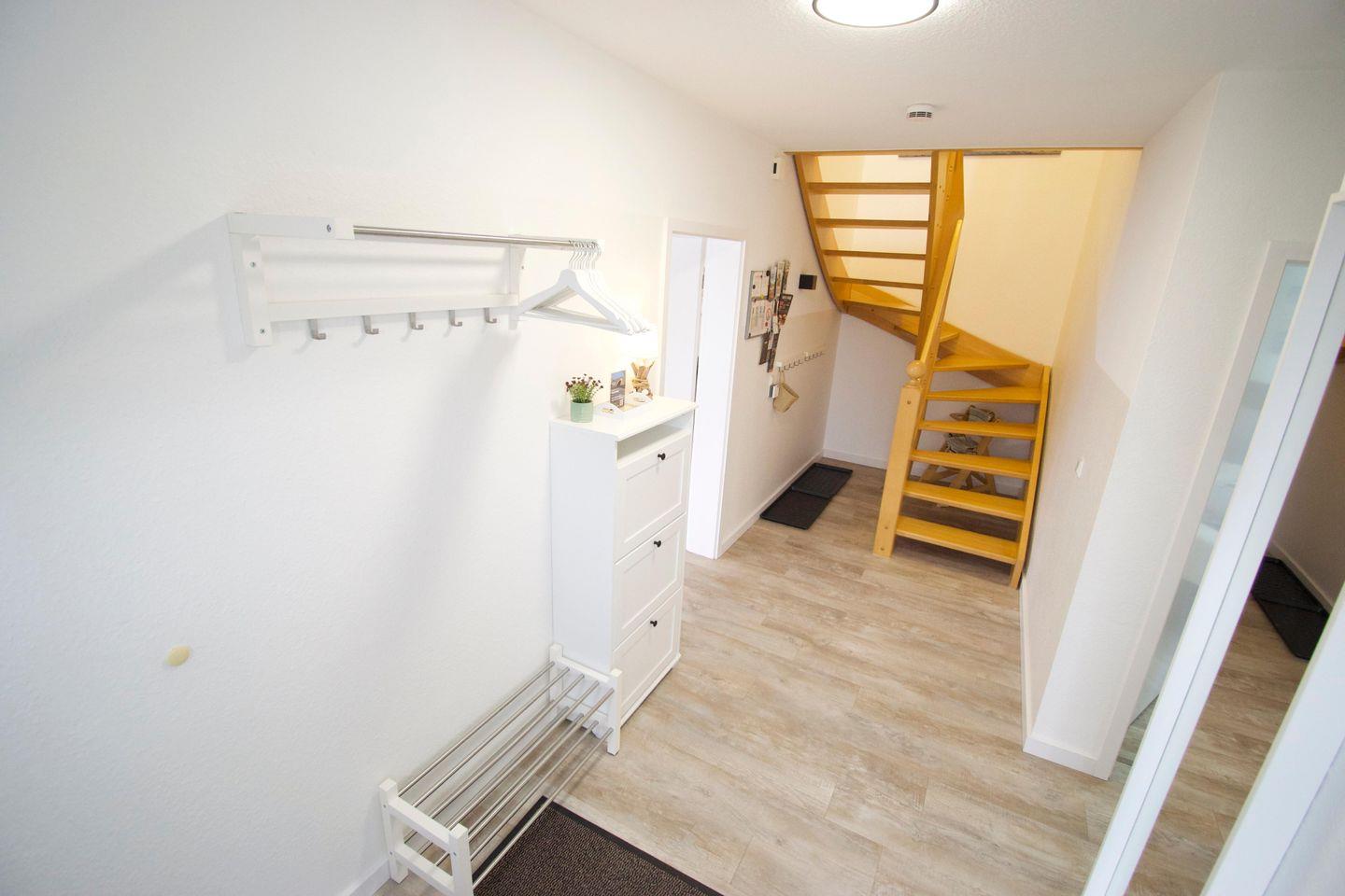 Im offenen Eingangsbereich gibt es ausreichend Möglichkeiten, Schuhe und Jacken unterzubringen. In der angrenzenden Abstellkammer findet der Gast neben Staubsauger, Bügelbrett+Bügeleisen, Wäscheständer etc. auch genug Platz, um seine Einkäufe unterzubringen.
