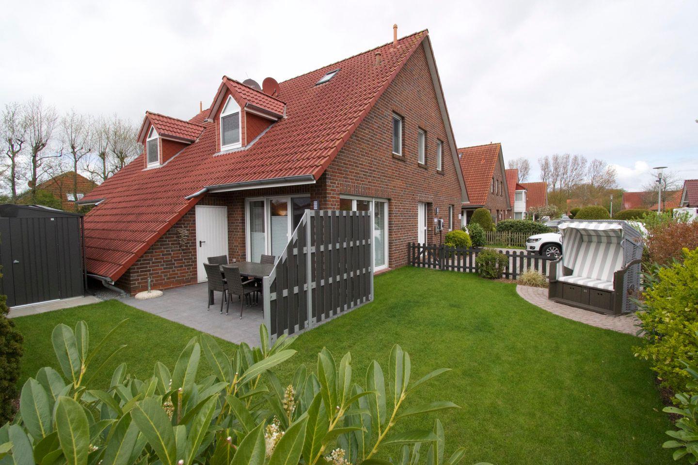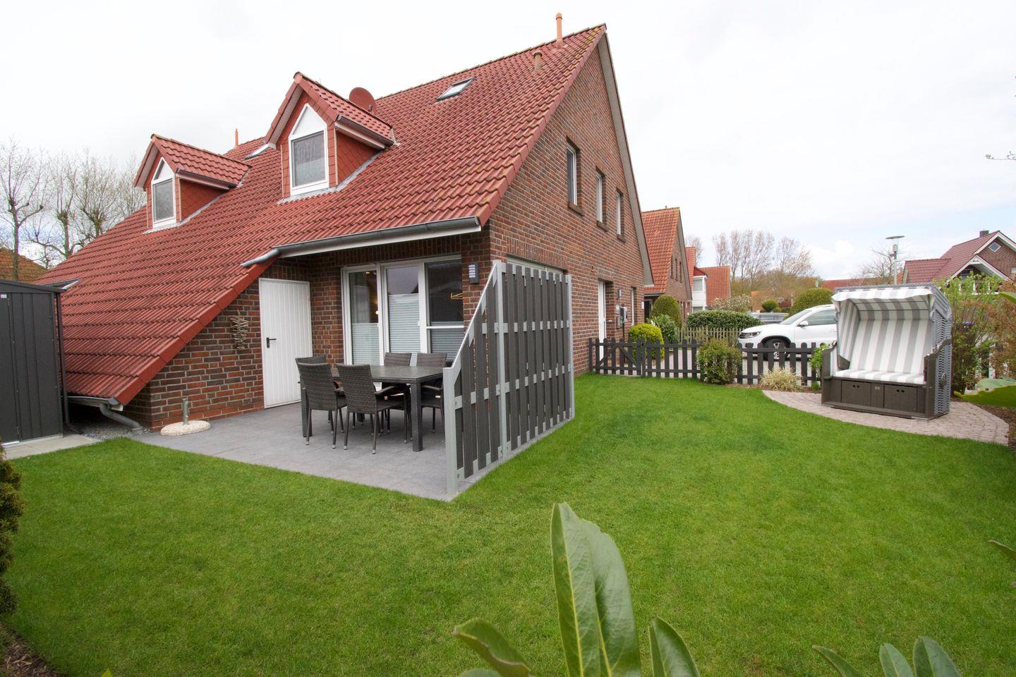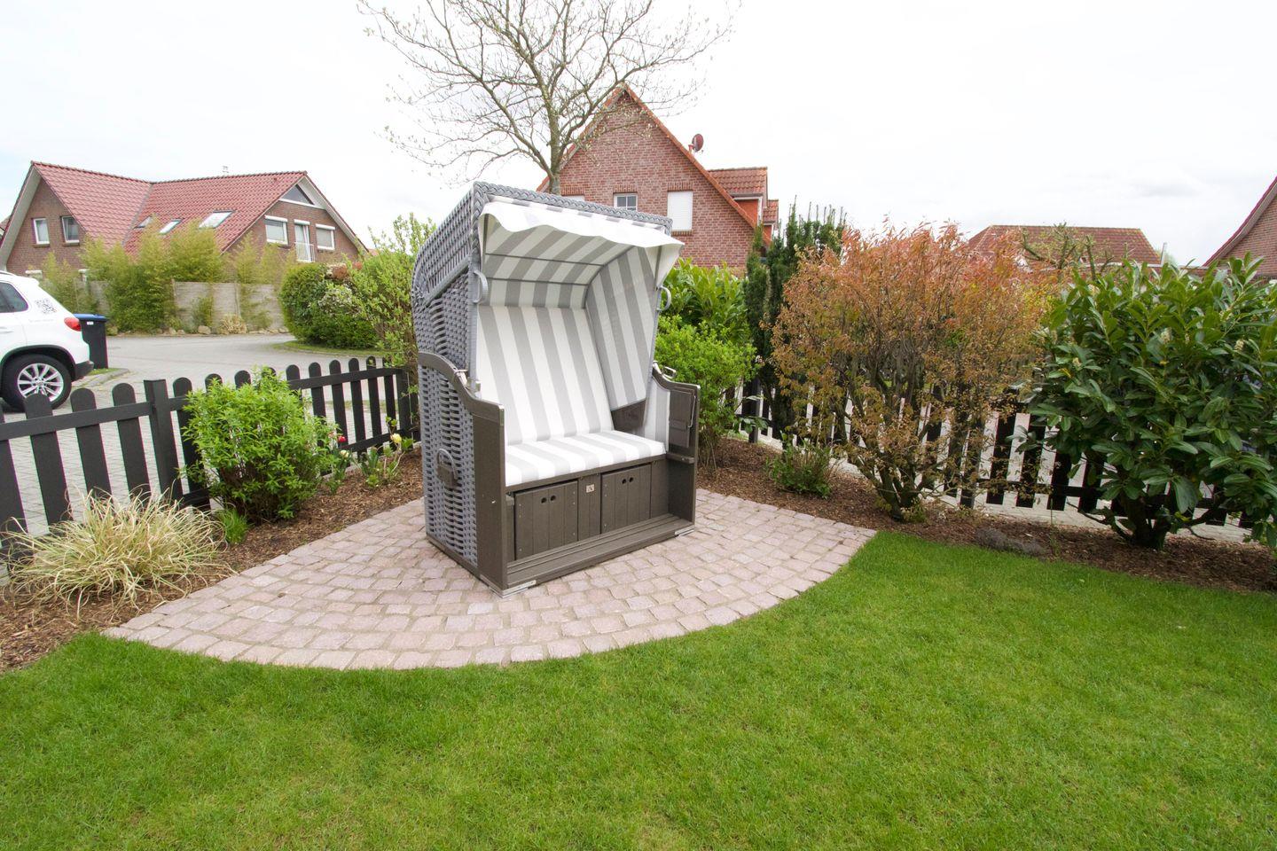 Im sonnenreichen Außenbereich lädt die Terrasse schon zum Frühstücken ein. Oder sie genießen die Ruhe und Sonne im Strandkorb. In der großen Abstellkammer finden sie genug Platz, um Fahrräder wettergeschützt unterzustellen. Ferner sind ein Holzbollerwagen, Liegen zum Sonnenbaden, eine Wäschespinne, Sandspielzeug sowie ein Holzkohlegrill vorhanden.