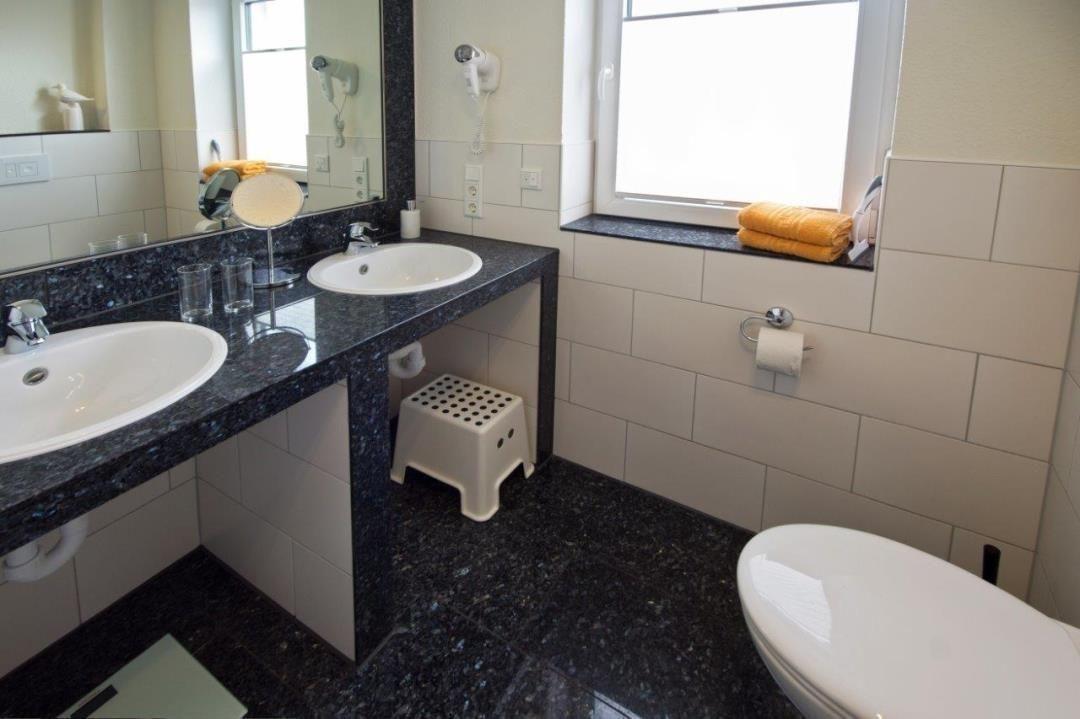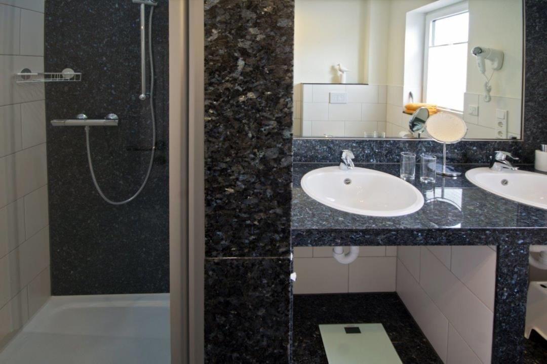 Das Badezimmer der Unterkunft ist ebenso wie die übrigen Räume ansprechend und modern gestaltet. Neben dem praktischen Doppelwaschtisch mit großem Spiegel steht Ihnen im Bad auch eine Dusche, ein WC sowie ein Fön zur Verfügung. Erwärmt wird der Raum durch eine Fußbodenheizung. Das große Tageslichtfenster sorgt für reichlich Licht und Luft im Badezimmer.
