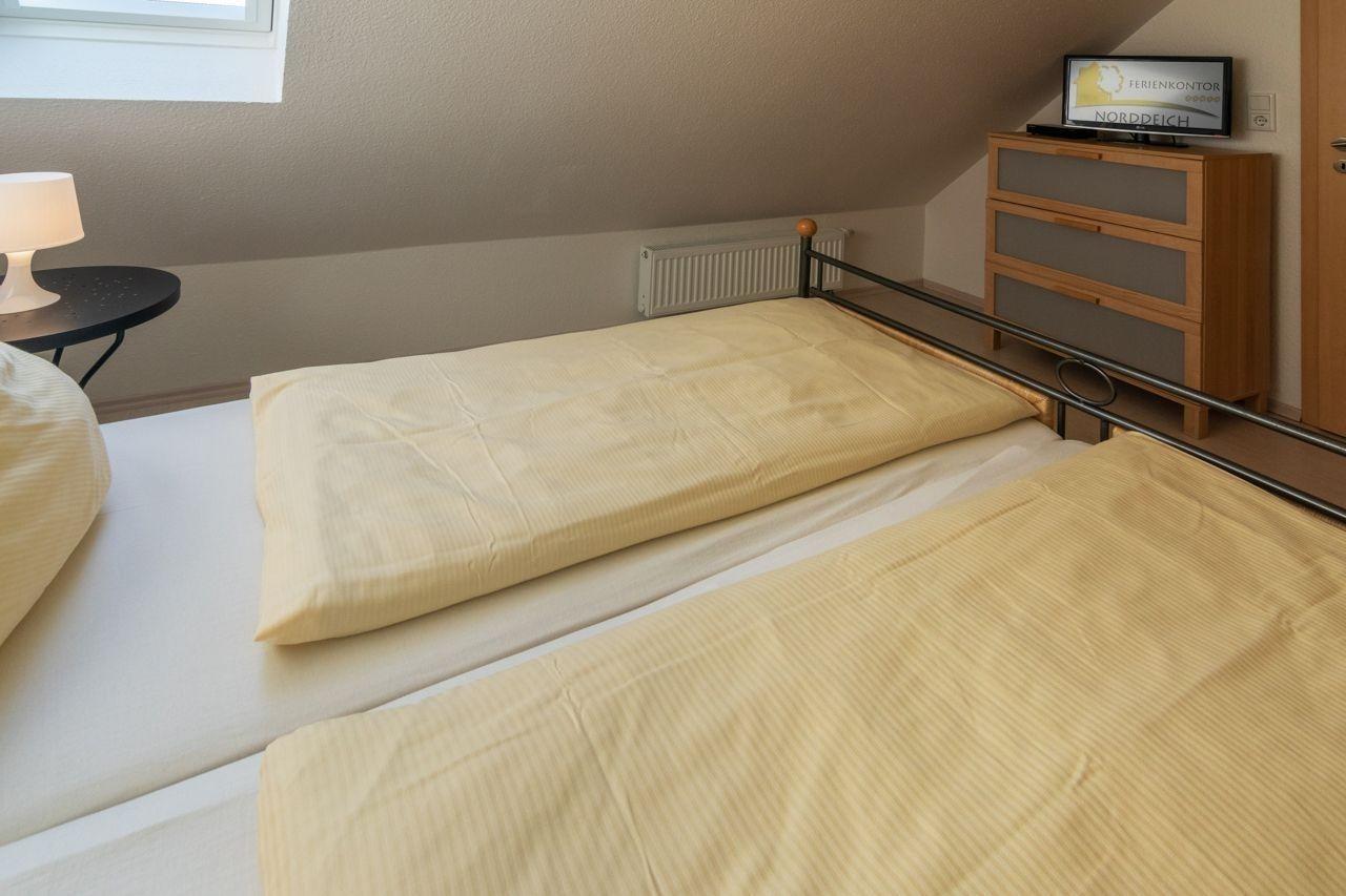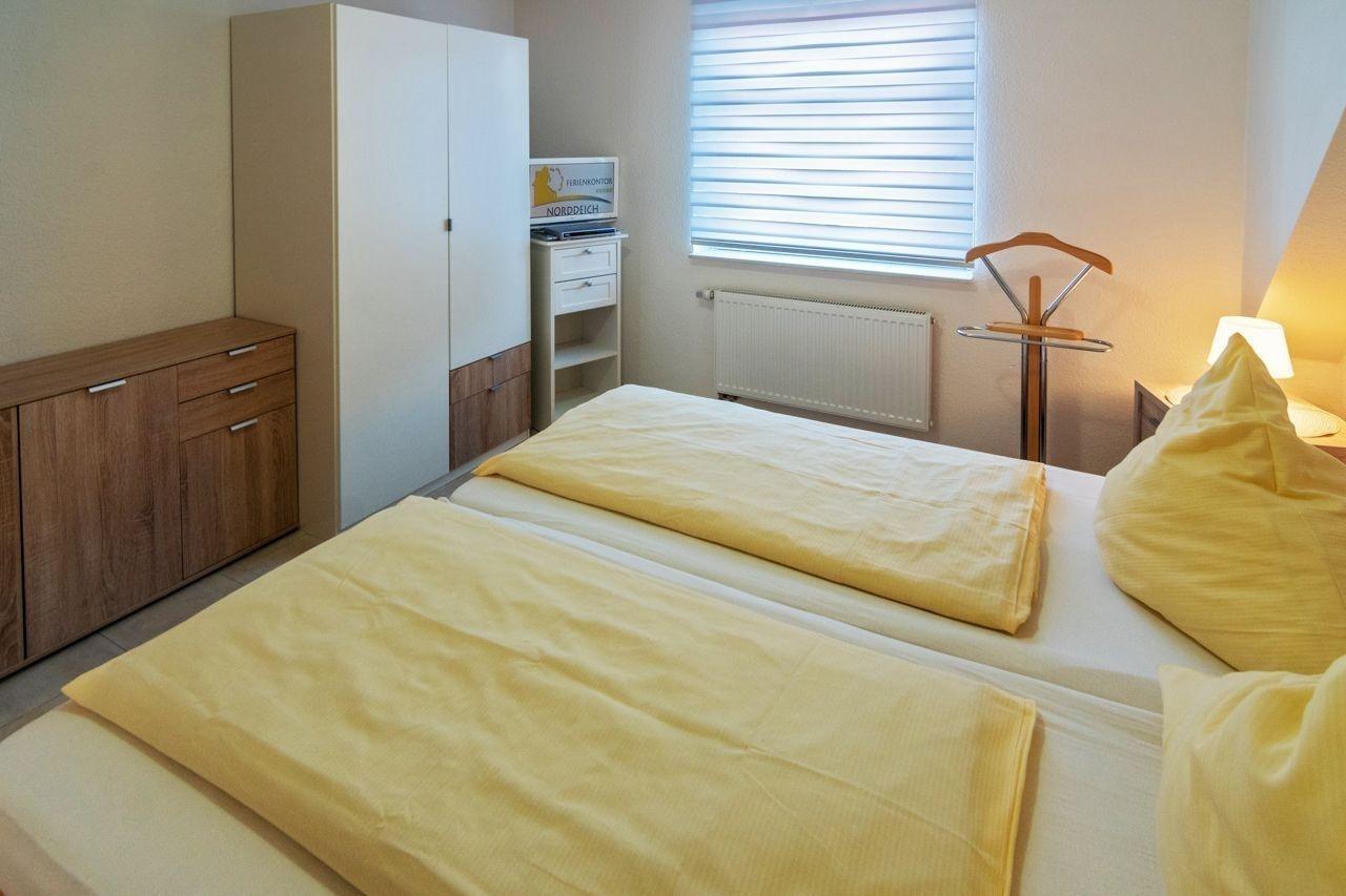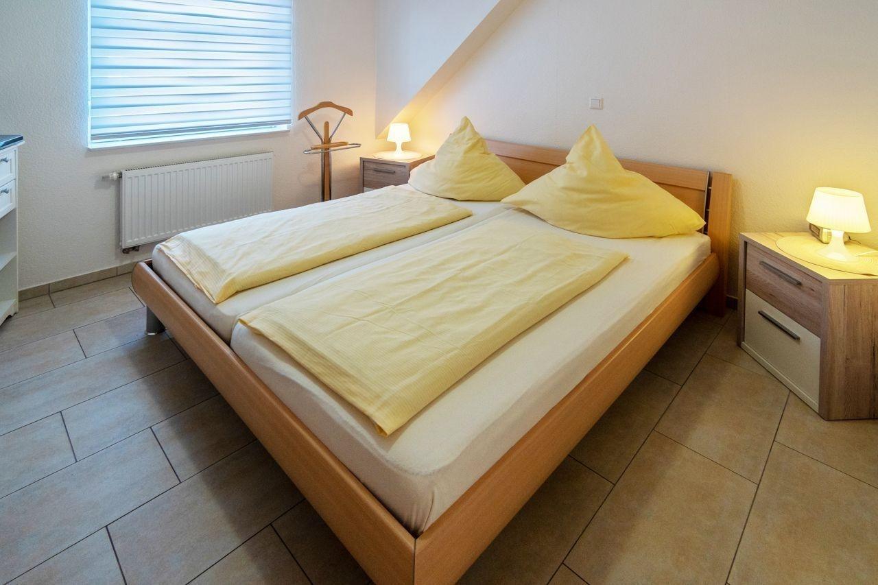 Gleich zwei Schlafzimmer laden zum Träumen ein. Der erste Schlafraum befindet sich im unteren Stockwerk und wurde mit einem Doppelbett (180x200cm) möbliert. Kleiderschrank und Kommode bieten reichlich Stauraum für Ihr Gepäck. Ein Herrendiener sowie ein kleines TV-Gerät runden den Raum ab und sorgen für zusätzlichen Komfort.