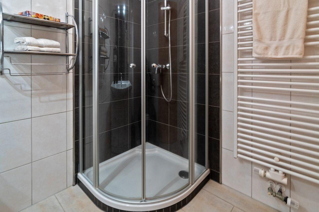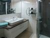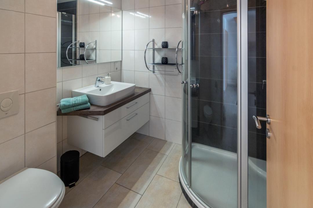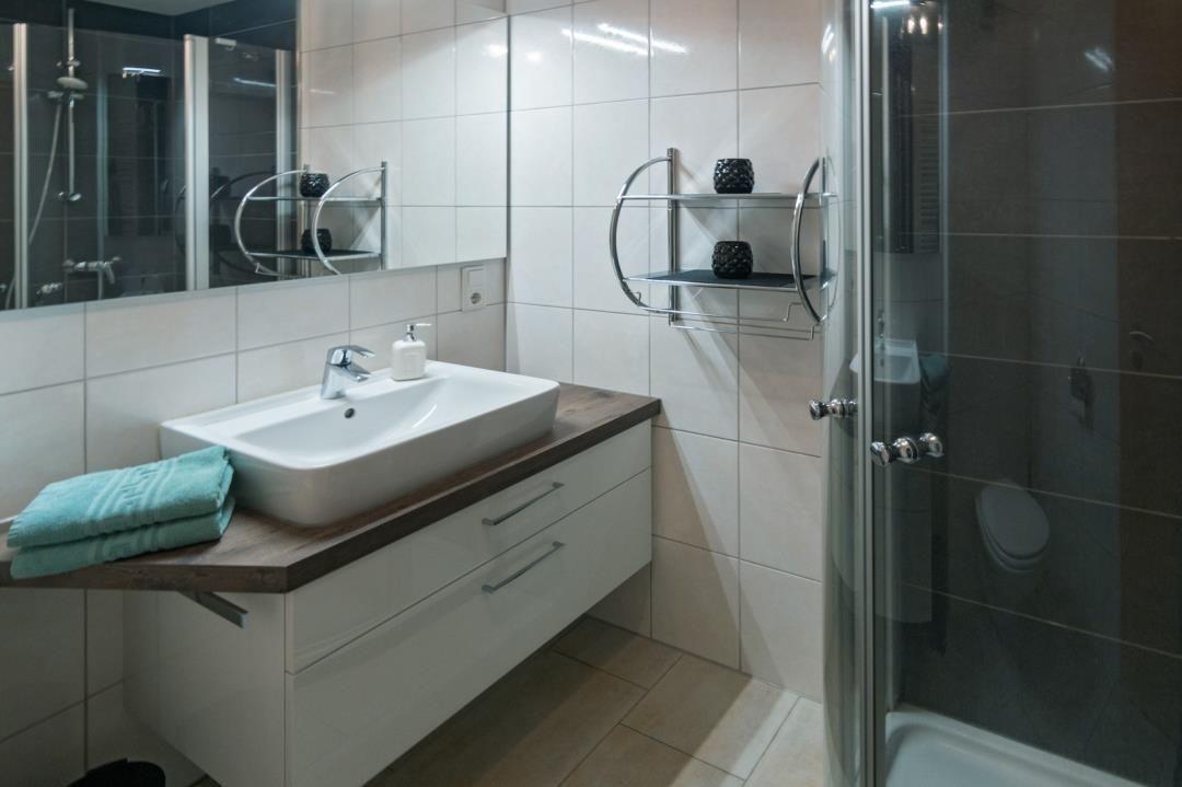 Das komfortable Badezimmer rundet die Ferienwohnung stimmig ab. Eine bodennahe Eckdusche sowie eine Waschkombination mit Spiegel sorgen hier für Komfort. Ein Duschhocker und ein Föhn gehören ebenfalls zum Inventar des Badezimmers.