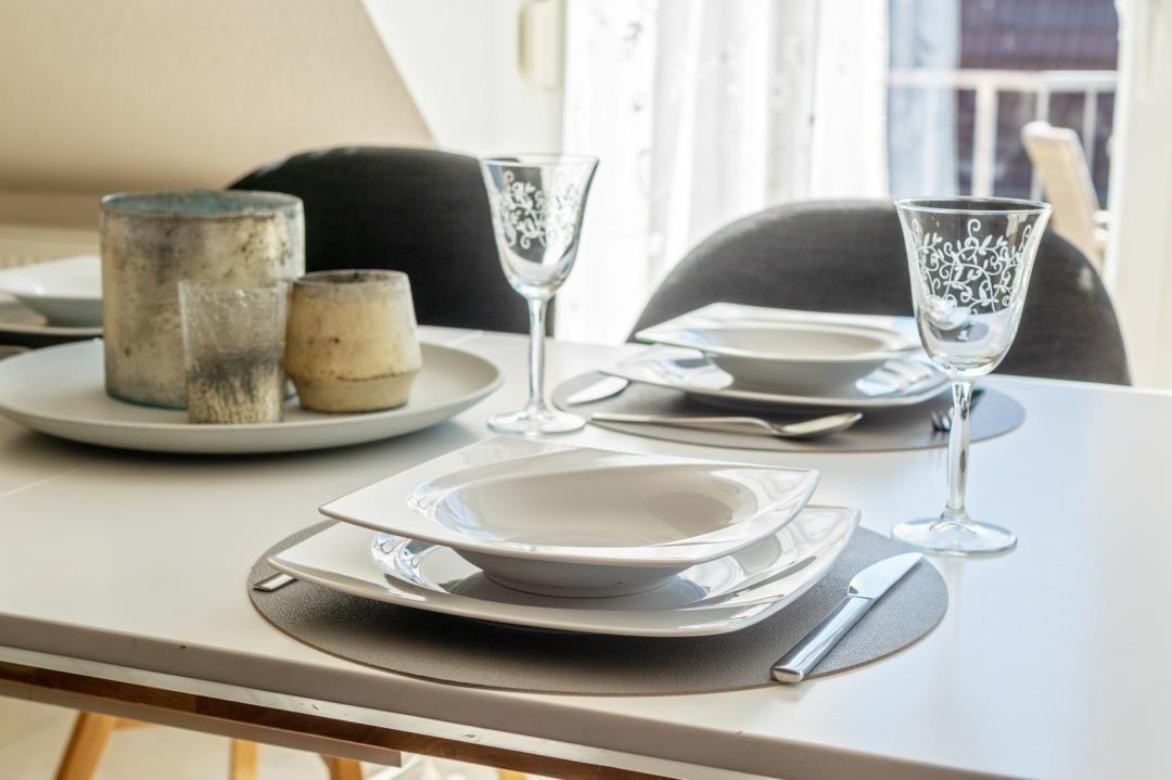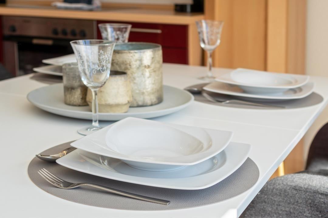 Ein Herd mit Backofen wurde ebenso in die Küchenzeile integriert wie ein Geschirrspüler und eine Mikrowelle. Auch eine Kaffeemaschine steht bereit. Kühlschrank, Toaster, Eierkocher sowie ausreichend Geschirr und Besteck runden die Ausstattung der Küche ab.