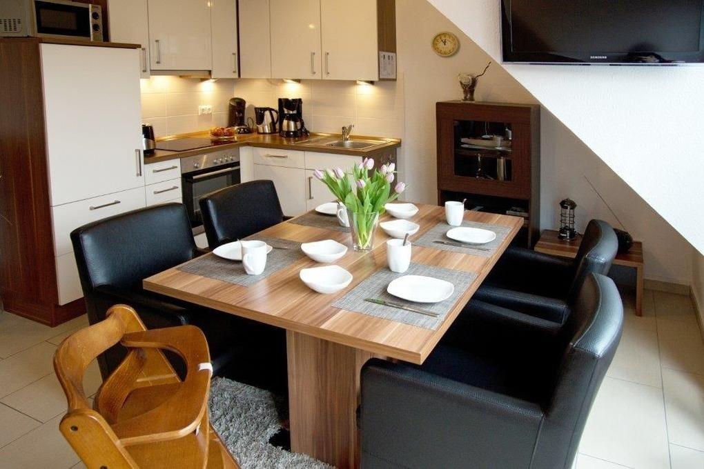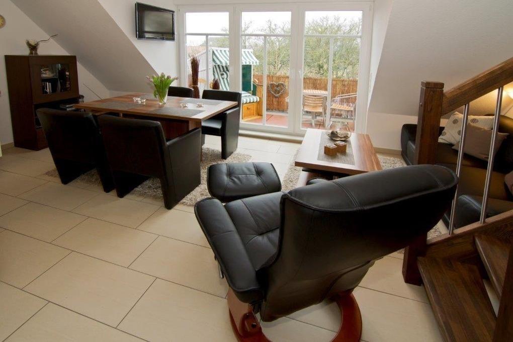 Unsere hochwertig ausgestattete Ferienwohnung glänzt durch viel Luxus, um Ihren Aufenthalt so angenehm wie möglich zu machen. Dazu zählt nicht nur die Fußbodenheizung im gesamten Wohnbereich, sondern auch das bequeme Ledersofa und technische Finessen, wie ein LCD-Fernseher in der Küche und im oberen Schlafraum. Ergänzt wird das ganze durch einen DVD Player (inklusive DVD) sowie eine kleine Musikanlage mit USB-Anschluss.