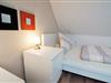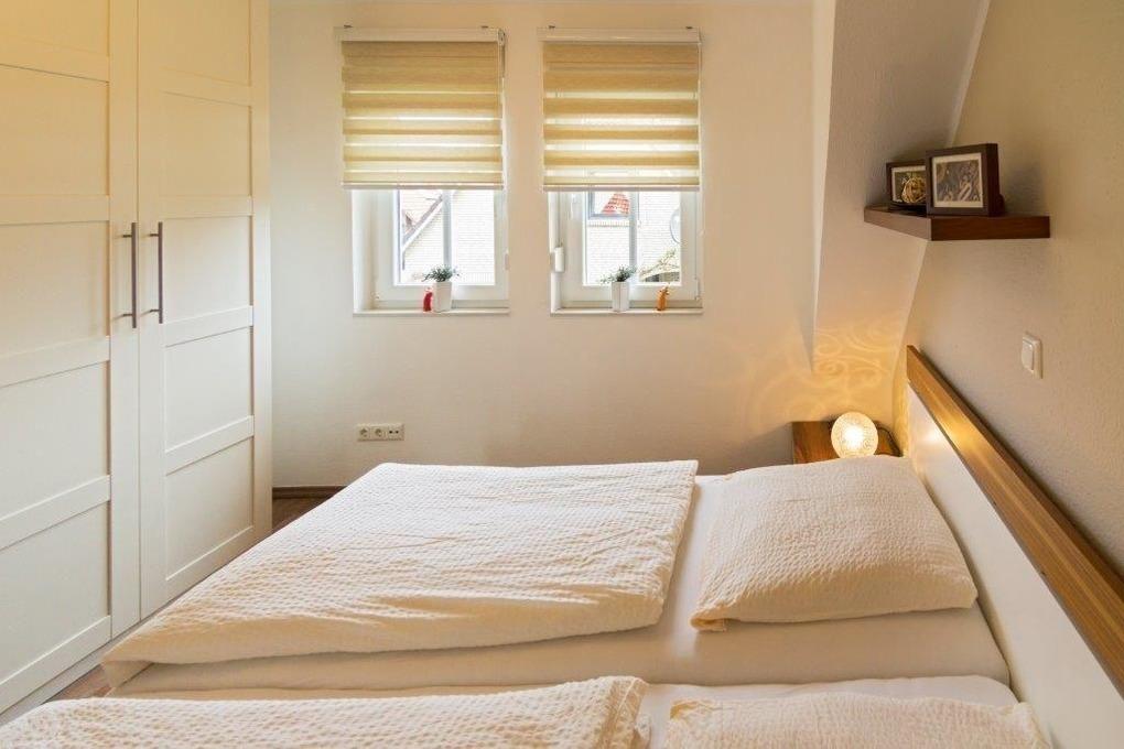 Die beiden Schlafzimmer dieser Wohnung sind mit einem Doppelbett ausgestattet, ein Schlafraum liegt im Obergeschoss, das andere Schlafzimmer dieses verfügt über 2 getrennte Betten. Im Schlafzimmer 2 befindet sich ein LCD-Fernseher. Zum Interieur gehören zwei Nachttische, ein Wecker oder Radiowecker und Nachttischlampen. Der Kleiderschrank mit Kleiderbügeln reicht für Ihre Urlaubsgarderobe aus. Für die Jüngsten steht ein zustellbares Reisekinderbett zur Verfügung.