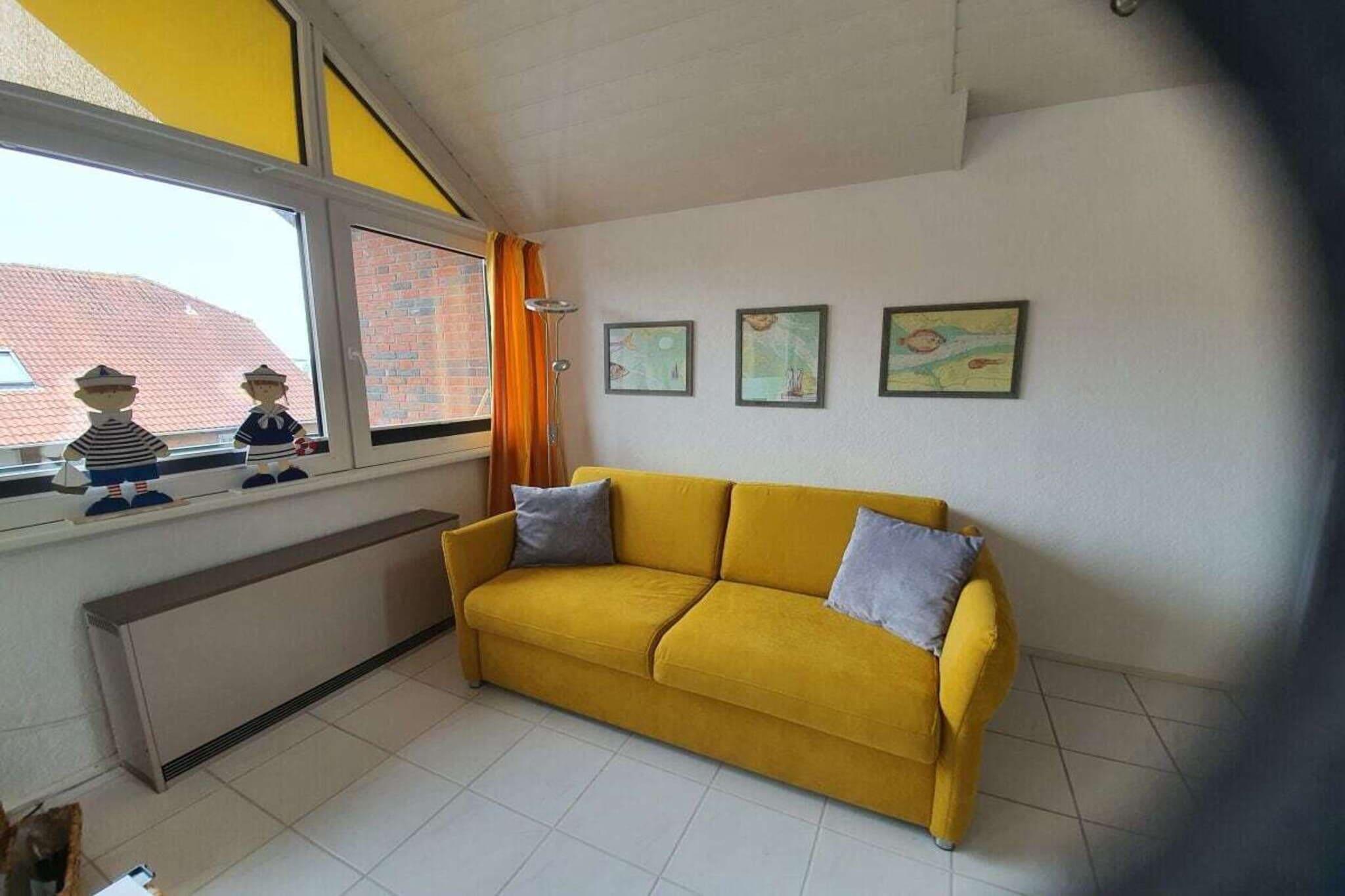 Ihre Ferienwohnung ist ein stilvoll eingerichtetes Einraumapparetment mit allem, was das Herz begehrt. Neben dem Badezimmer mit Dusche, finden Sie in dem großzügig geschnittenen Appartement eine moderne Küchenzeile mit Ceranfeld, Mikrowelle, Wasserkocher, Kaffemaschine und ausreichend Geschirr für kleine und größere Mahlzeiten vor. Die nagelneue Couch ist mit einem Handgriff zu einem vollwertigen Bett umzufunktionieren. Dadurch ist der für einen erholsamen Urlaub notwendige Schlafkomfort in dem dann 1,60m mal 2,00m großen Bett mit Lattenrost und Matratze bestens gegeben. Nach dem Aufstehen kann die Bettwäsche bequem in der zum Sofa gehörenden Truhe verstaut werden. Ein Esstisch mit vier Stühlen, der Flatscreen und natürlich ein Balkon mit Sicht auf den Deich runden die Wohnung ab.