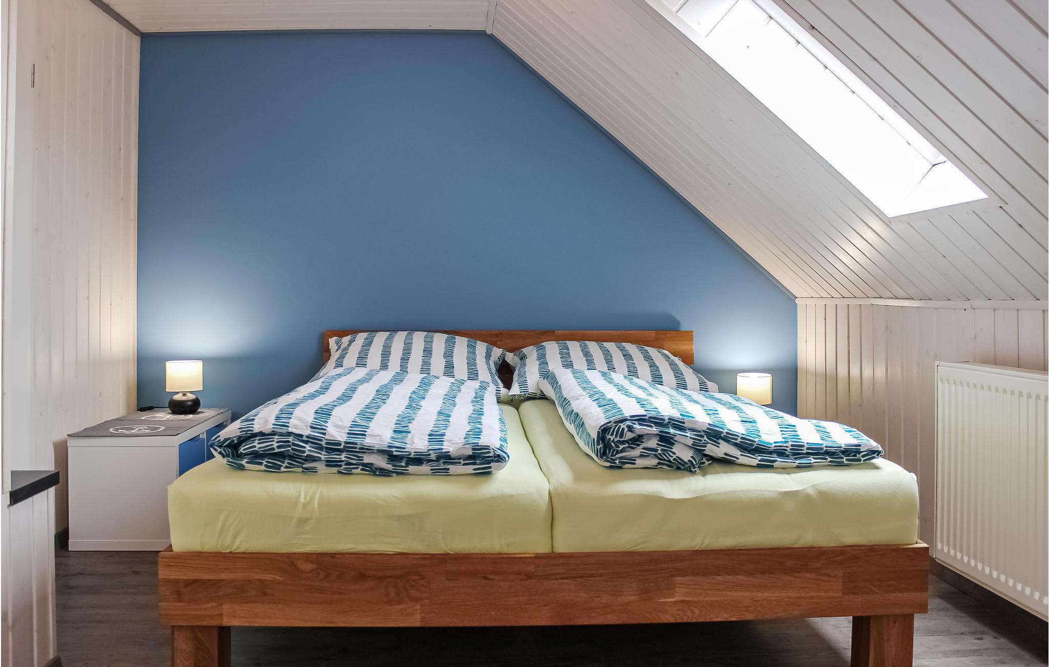 Ovenpå er der to soveværelser, hver med en dobbeltseng. Der er også et garderobeskab i et af de to soveværelser. I det andet soveværelse er der også en lille sammenklappelig sofa. På denne etage finder du også et badeværelse med bruser.