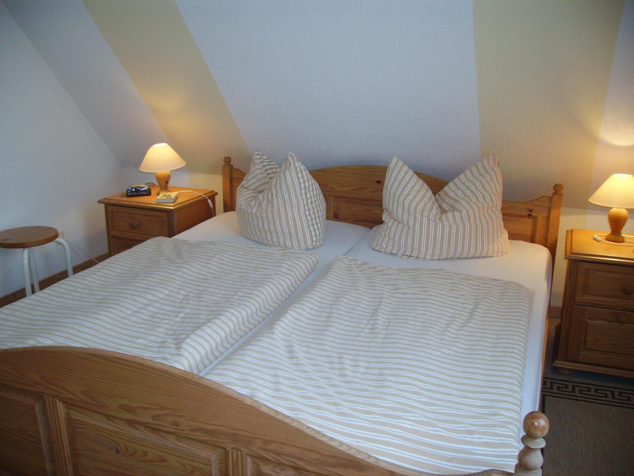 The separate entrance on the ground floor leads to an entrance hall with cloakroom. A staircase leads to the upper floor of the holiday flat. To the right is the bedroom with double bed (200x190) and a single bed (90x200), straight ahead is the kitchen area with fitted kitchen. To the left of the kitchen area is the bathroom and straight ahead through the kitchen area you enter the cosy living room with dining area. WLAN is available. The flat has gas central heating.