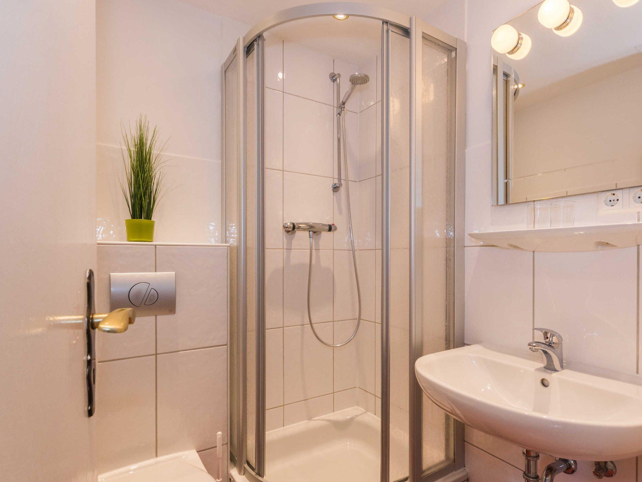 Die Badezimmer mit Dusche und WC, Fön, Kosmetikspiegel und Handtuchwärmer.