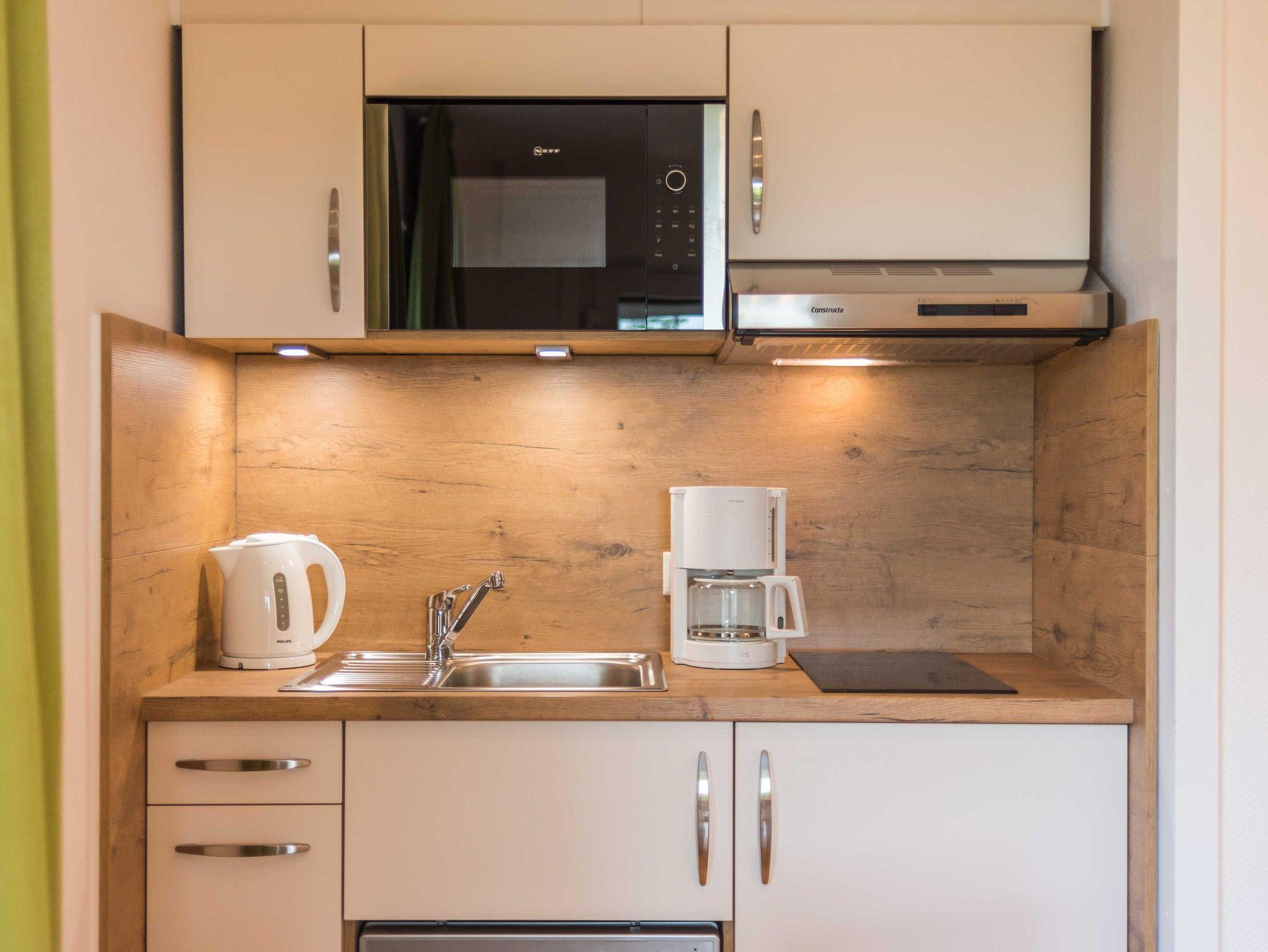 Die Küchenzeile verfügt neben dem Herd über eine kleine Spülmaschine, Kaffeemaschine, Wasserkocher, Toaster und ist mit Mikrowelle/Infrarot-Grill ausgestattet.