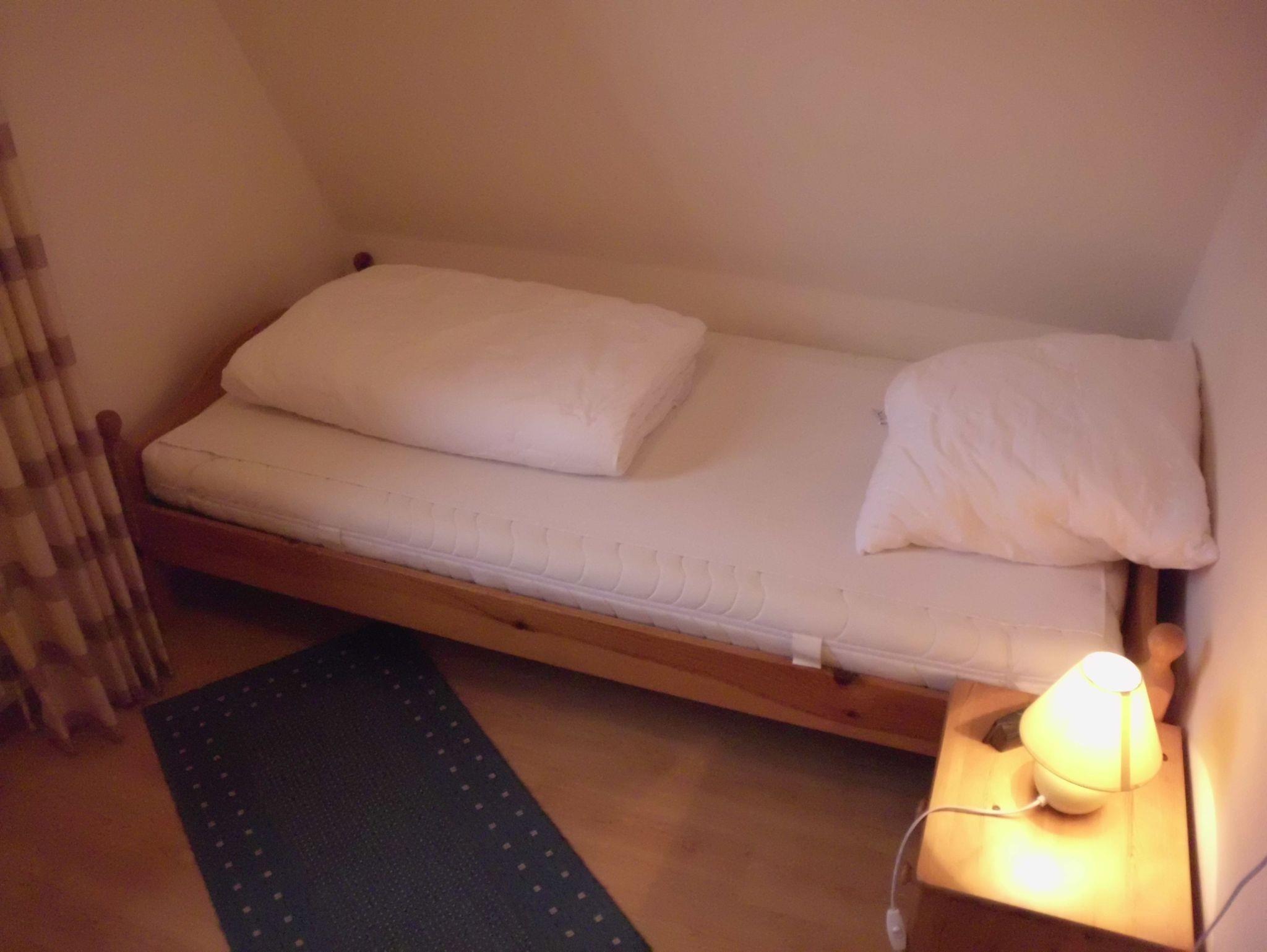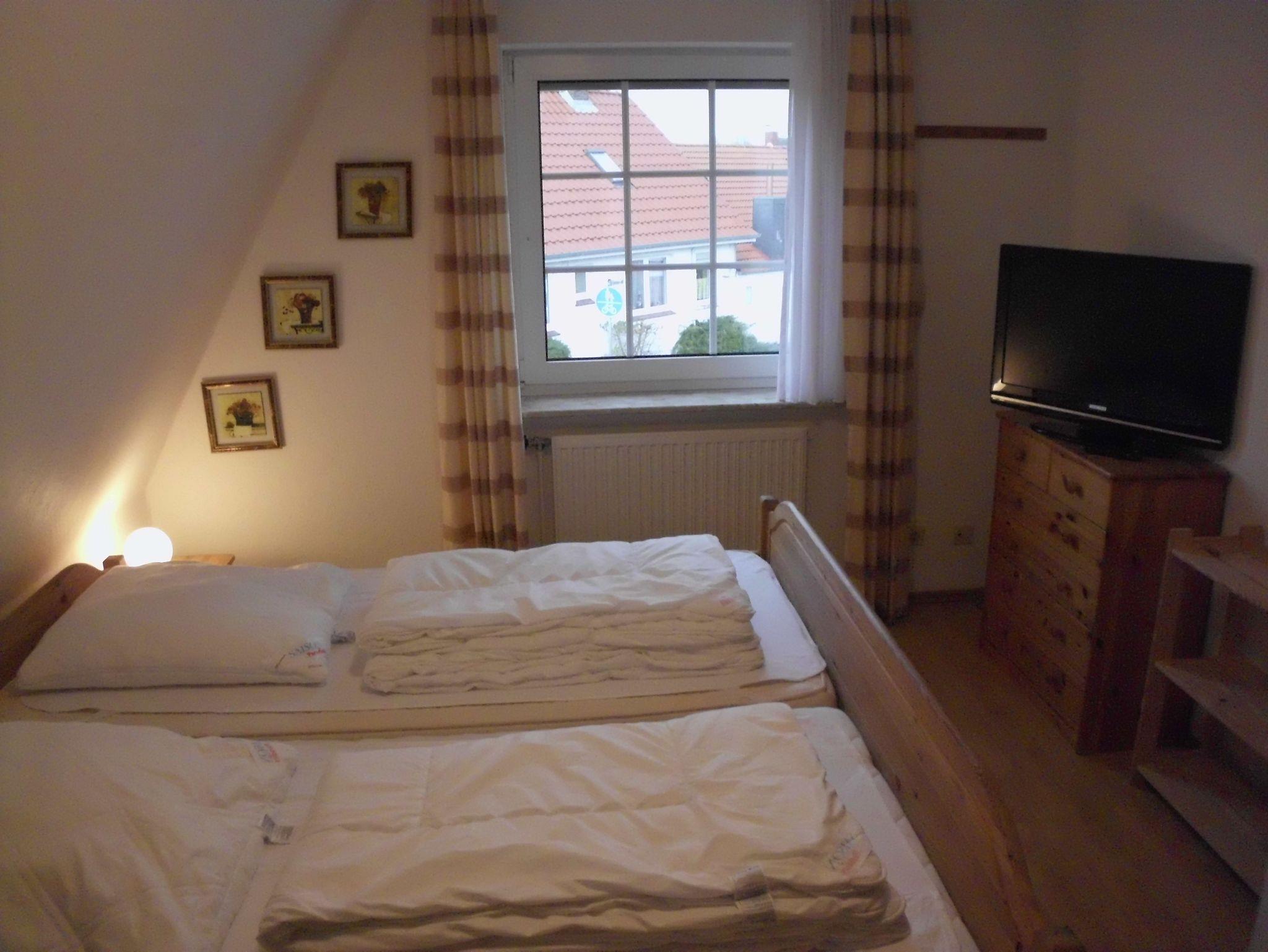 Im 1. Obergeschoss befindet sich das Badezimmer mit Dusche, WC und Waschmaschine. Auch finden Sie hier zwei Schlafzimmer, zum einen mit Doppelbett und Flachbild-TV und einen Schlafraum mit einem Einzelbett. Über den Flur gelangen Sie über eine steile Raumspartreppe in den offenen Schlafraum im Dachgeschoss, dort finden Sie zwei Einzelbetten und einen weiteren Flachbild-TV. Zum Haus gehört eine Garage, das Gartengrundstück ist vollständig eingezäunt und somit für kleine Kinder und Hunde (erlaubt 1 Hund, 2ter Hund nur mit Absprache) gut geeignet.