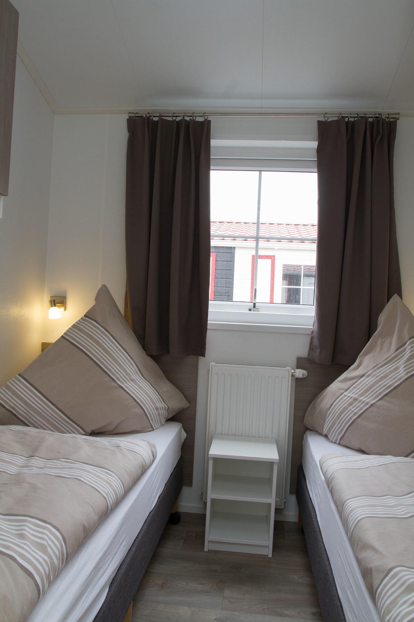 Ferienhaus mit rd. 45m² und Platz für bis zu vier Personen. 2 Schlafzimmer davon 1 mal mit Doppelbett und TV und 1 mal mit zwei Einzelbetten, 1 Badezimmer. Großer Wohnraum mit Küche, Sitzgelegenheiten und Unterhaltungsmedien (TV). Im Außenbereich gibt es einen Stellplatz für Ihr Auto und die Terrasse lädt zum gemütlichen Verweilen ein. Die Chalets befinden sich in einem eigenen Parkareal unseres Platzes mit eigener Zufahrt.
