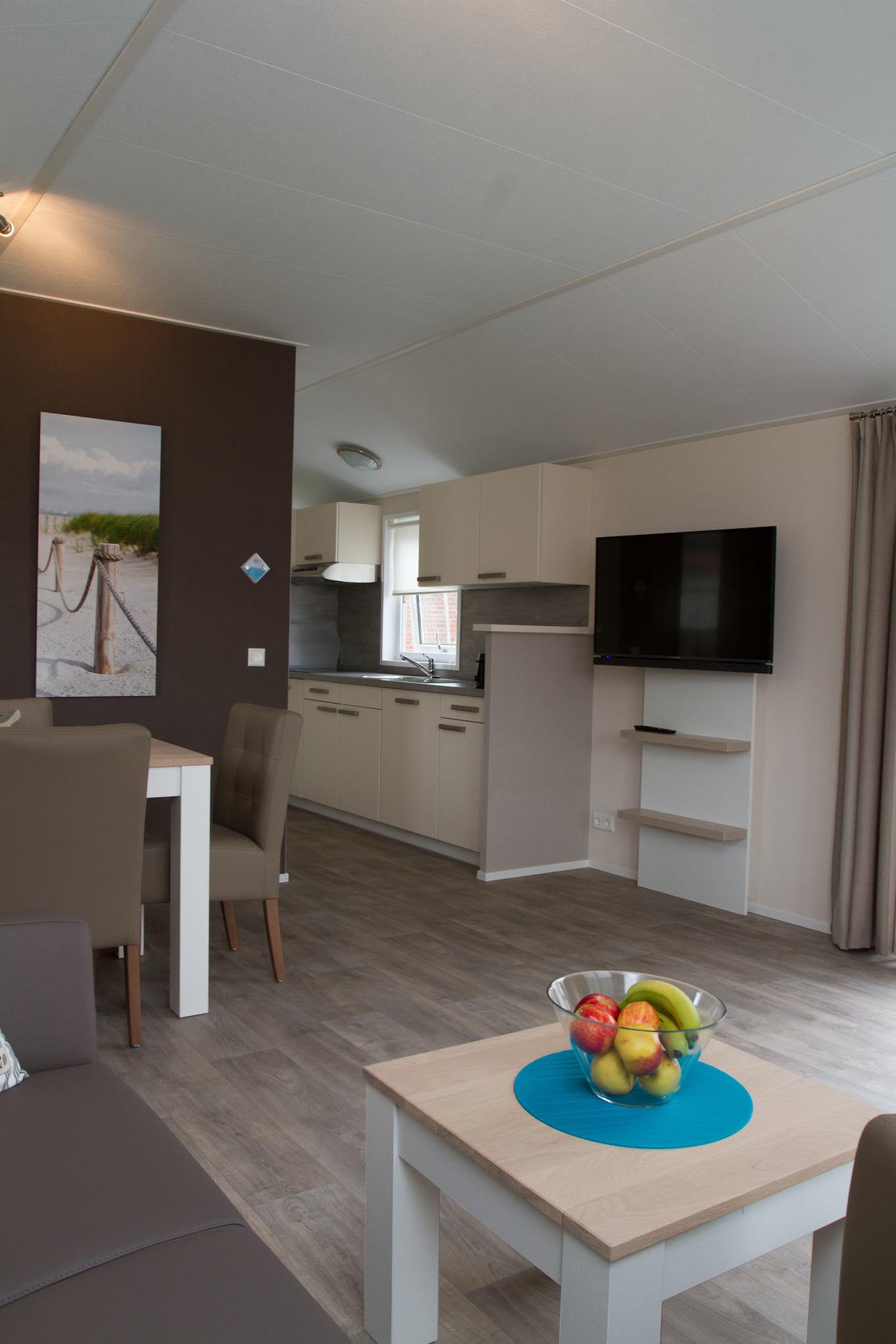 Ferienhaus mit rd. 45m² groß und Platz für bis zu zwei Erwachsene und drei Kindern. 2 Schlafzimmer (eines mit Doppelbett und TV, eines mit Crossbett), 1 Badezimmer. Großer Wohnraum mit Küche, Sitzgelegenheiten und Unterhaltungsmedien (TV). Im Außenbereich gibt es einen Stellplatz für Ihr Auto und die Terrasse lädt zum gemütlichen Verweilen ein.
