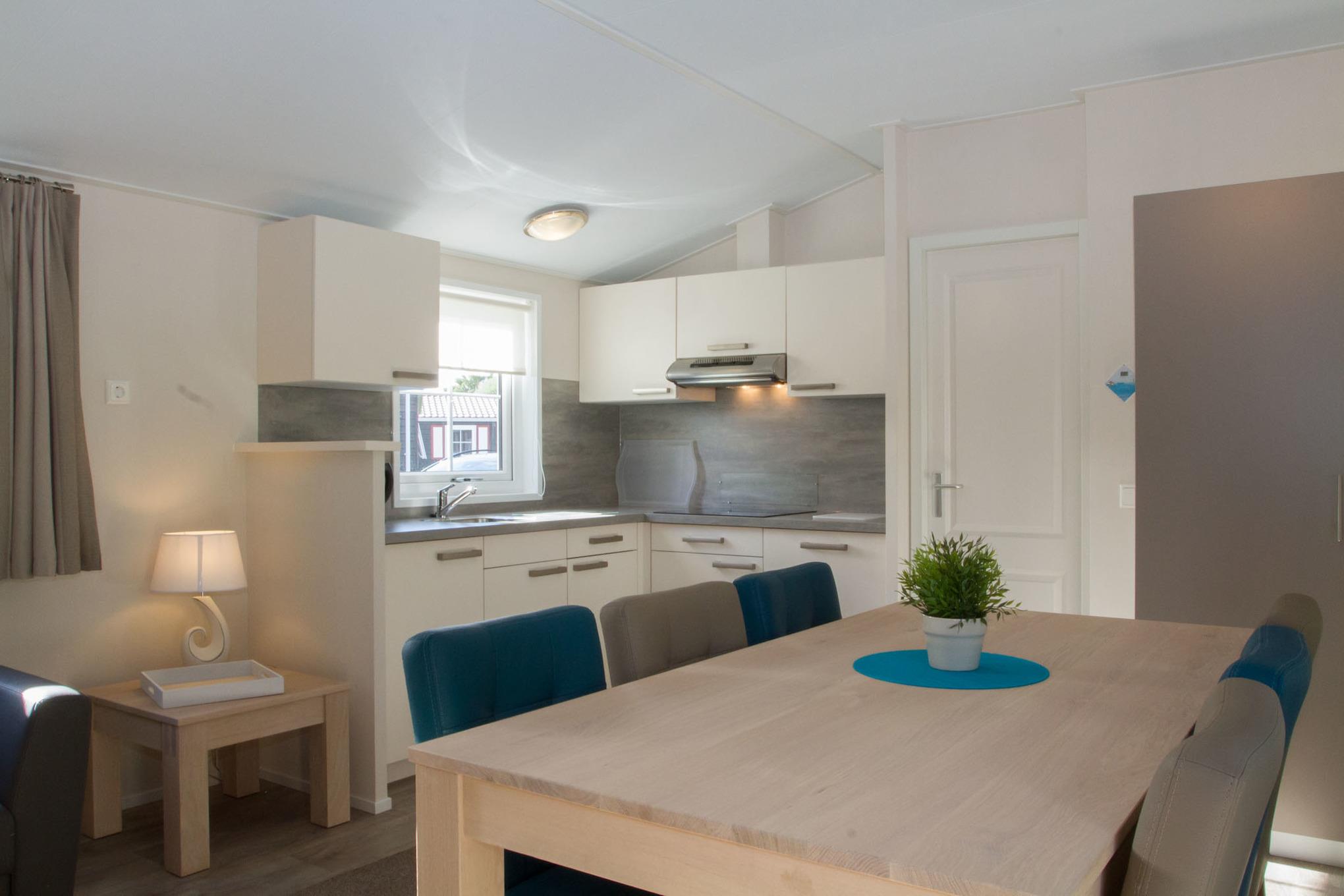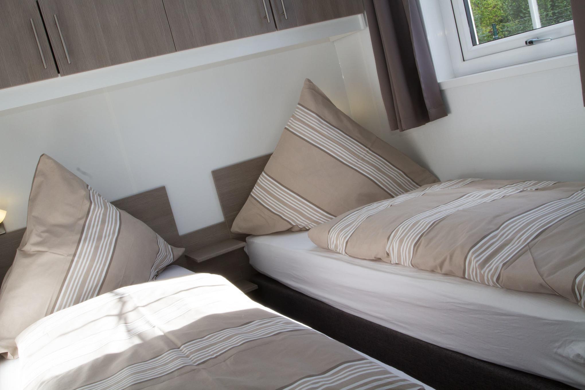 Ferienhaus mit rd. 50m² und Platz für bis zu sechs Personen. 3 Schlafzimmer (davon 2 mit TV und 1 mal Etagenbett), 2 Badezimmer. großer Wohnraum mit Küche, Sitzgelegenheiten und Unterhaltungsmedien (TV). Im Außenbereich gibt es einen Stellplatz für Ihr Auto und die Terrasse lädt zum gemütlichen Verweilen ein. Die Chalets befinden sich in einem eigenen Parkareal unseres Platzes mit eigener Zufahrt.