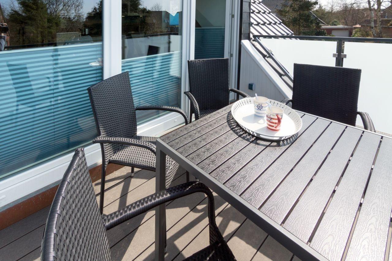 Das Feriendomizil Meereswind verfügt über einen schönen Sonnenbalkon in südwestlicher Ausrichtung. Hier genießen Sie die Sonne bis in den Abend hinein. Eine ansprechende Möblierung mit Tisch und Stühlen bietet Ihnen die Möglichkeit an der frischen Luft zu entspannen oder gemeinsame Mahlzeiten auch mal ins Freie zu verlegen.