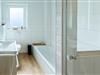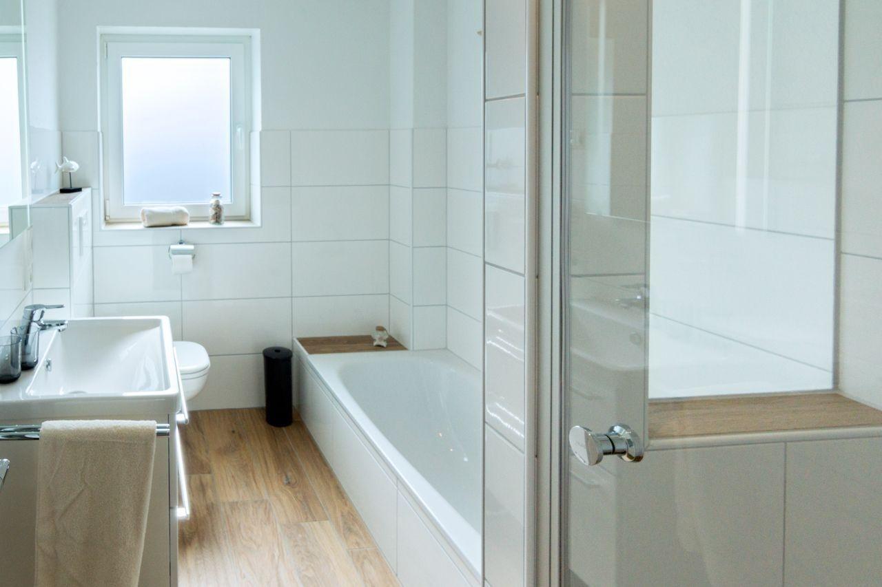 Das zweite Badezimmer ist das Hauptbad der Wohnung. Es handelt sich um ein Vollbad mit Badewanne und Dusche. Zusätzlich erwartet Sie hier eine Waschkombination mit großem, beleuchtetem Spiegel. Ein Haartrockner gehört zu den weiteren Vorzügen des Bades.