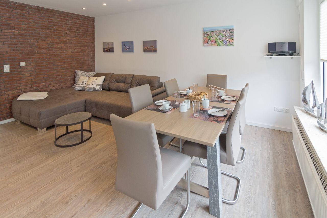 Herzstück der Wohnung ist der offen gestaltete, lichtdurchflutete Wohn-/Essraum im Erdgeschoss. Kleine und mittelgroße Hunde sind in dieser Ferienwohnung herzlich willkommen!
