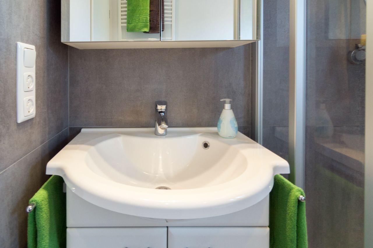 WC, Waschkombi mit reichlich Stauraum sowie ein beleuchteter Spiegelschrank, ein kleiner Schminkspiegel und ein Haartrockner runden die Ausstattung des Badezimmers ab.