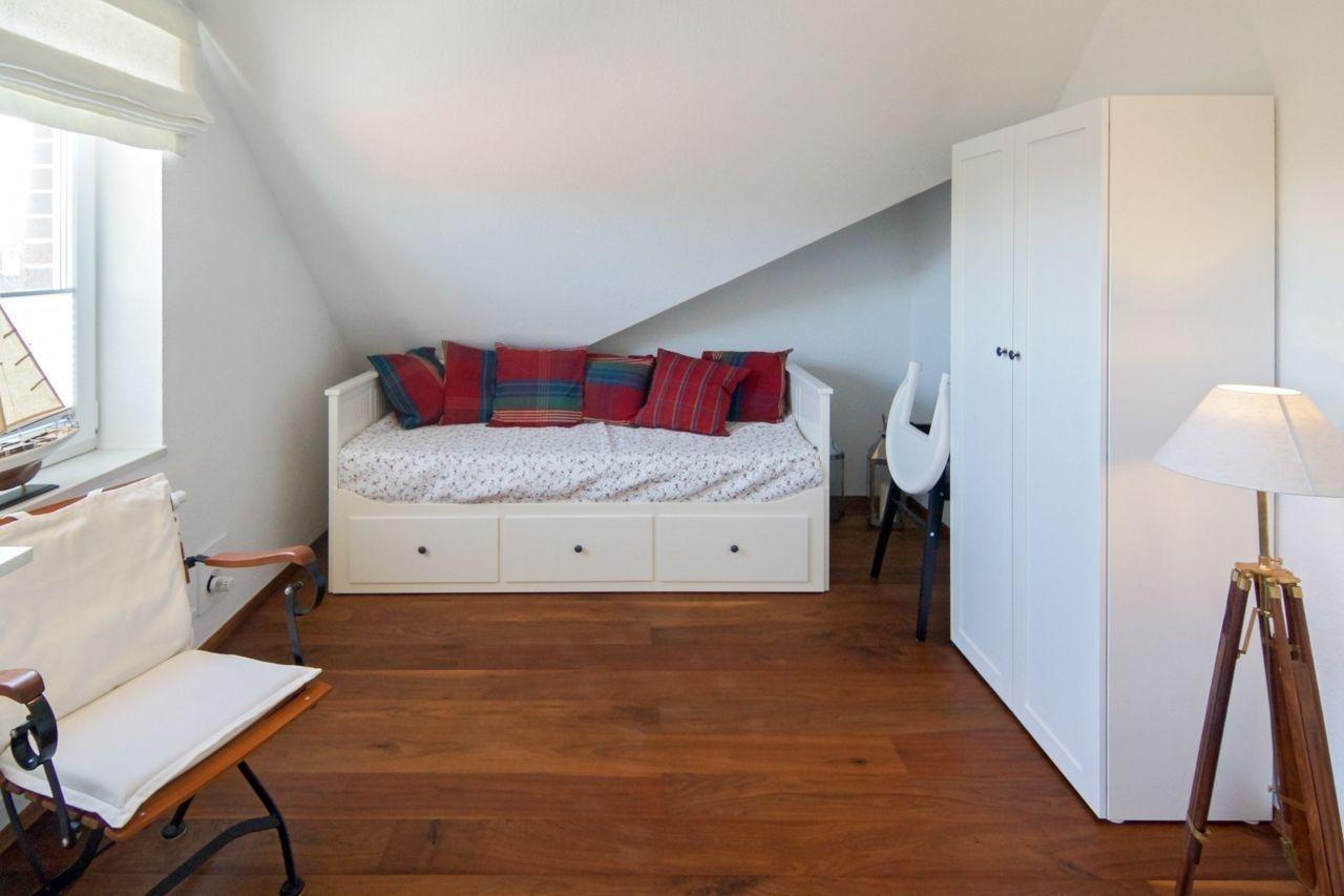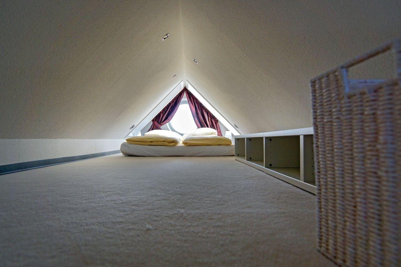 Zwei Personen finden in dem großzügigen Elternschlafzimmer mit dem hohen Doppelbett Platz. Wie auch der Wohnbereich ist dieser Raum mit einem modernen Flat-TV ausgestattet. In einem weiteren Beistellbett kann auch ein Kind zusätzliche seine Nachtruhe finden. Zudem besitzt das Loft einen ausgebauten Spitzgiebel, in dem sich ein unkonventionelles Matratzenlager befindet – ideal für ältere Kinder, die gerne in den Sternenhimmel hinausschauen möchten.