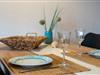 Die im Wohnbereich eingebundene geräumige Küchenzeile bietet allen notwendigen Komfort, um gemeinsam zu kochen und zu speisen. Zur Ausstattung gehören ein Cerankochfeld, ein Backofen, ein Kühlschrank, eine Kaffeemaschine, eine Mikrowelle, ein Toaster sowie ausreichend Geschirr, Besteck und Gläser. Der Esstisch bietet Platz für bis zu vier Personen.