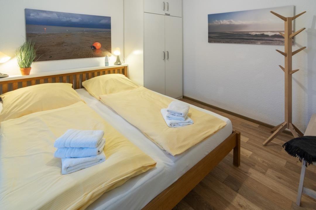 Das Feriendomizil verfügt über einen Schlafraum, der mit einem 180 x 200 cm großen Doppelbett ausgestattet ist. Die Garderobe findet im geräumigen Kleiderschrank ausreichend Platz. Zudem ist hier sowohl eine Sitzbank als auch ein Garderobenstände für Jacken und andere Accessoires vorhanden. Kleinen Familien steht auf Wunsch ein Baby-Reisebettchen zur Verfügung. Da das Sofa sich zu einem Bett umbauen lässt, ist Hygge auch ein beliebtes Feriendomizil für kleine Familien.