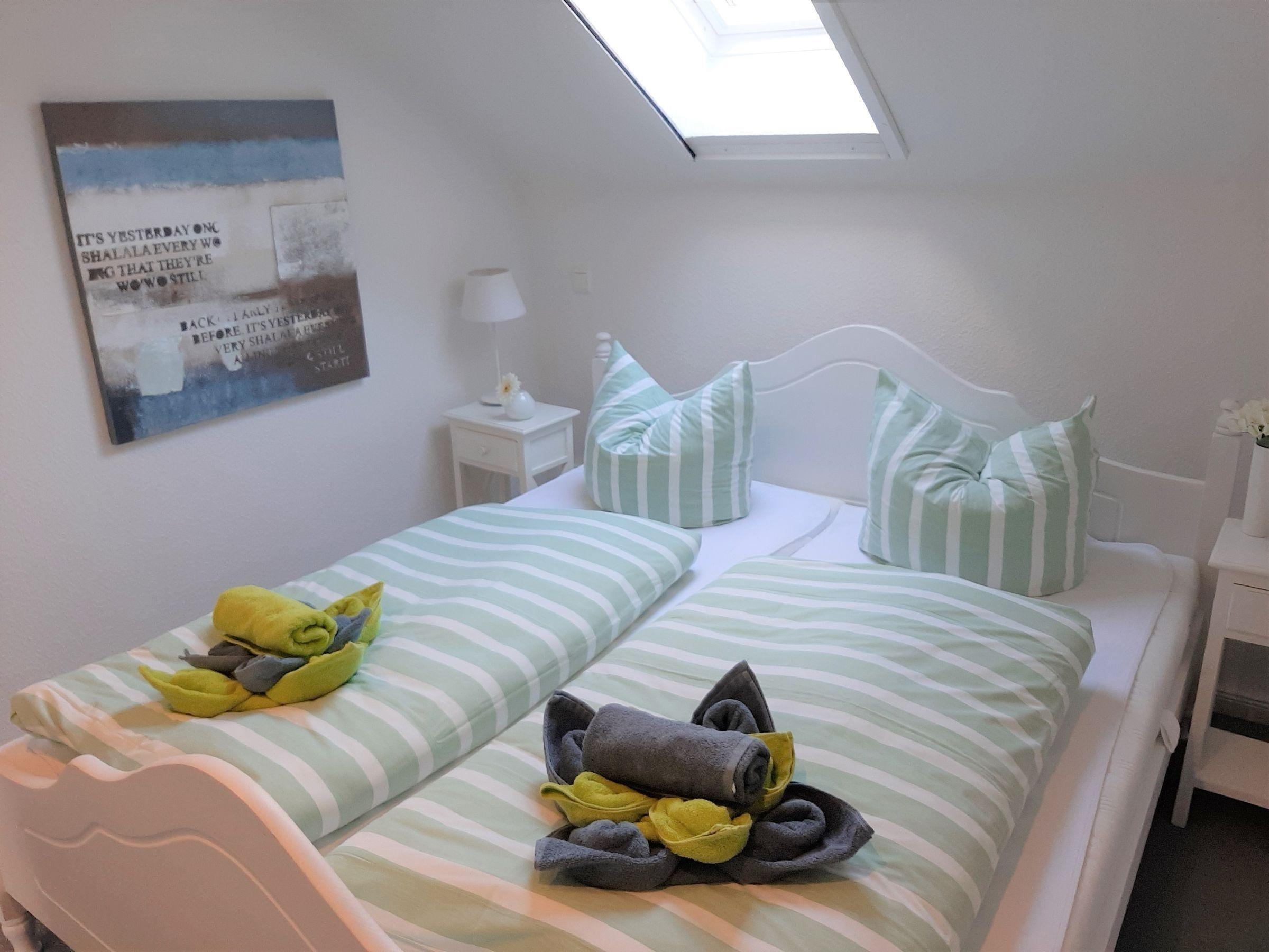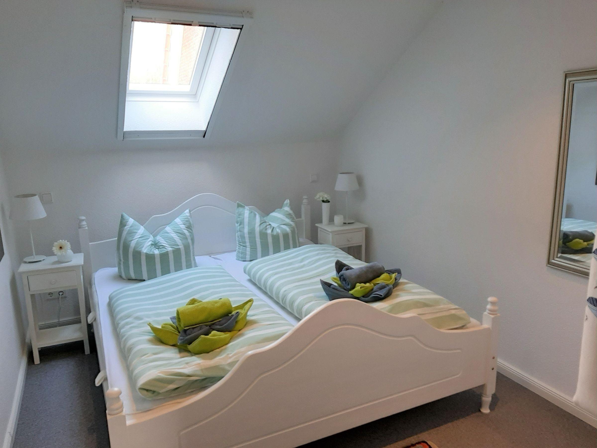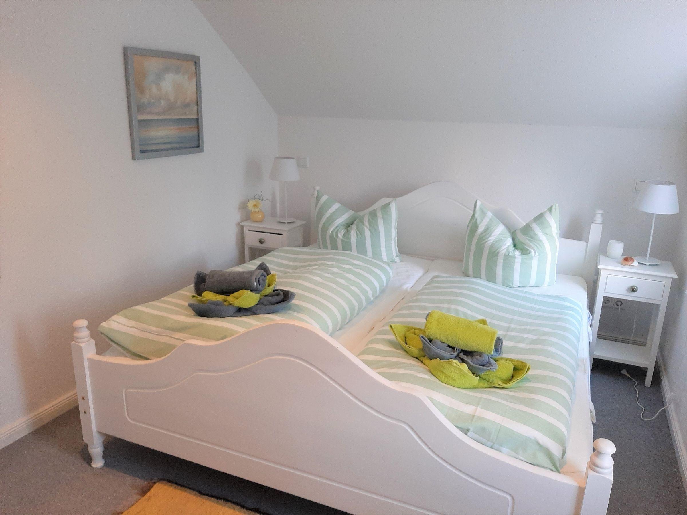 Die Ferienwohnung bietet eine moderne und allergikerfreundliche Ausstattung, die den Aufenthalt zum Vergnügen macht. Sie verfügt über zwei geräumige Schlafzimmer mit jeweils einem Doppelbett, ideal für Paare oder Familien. Die offene Küche ist voll ausgestattet und lässt keine Wünsche offen: Ein Geschirrspüler, Elektro- und Gasherd, Backofen, Mikrowelle, Kühlschrank, Kaffeemaschine, Toaster und Wasserkocher stehen zur Verfügung. Der einladende Esstisch lädt zu gemeinsamen Mahlzeiten ein.