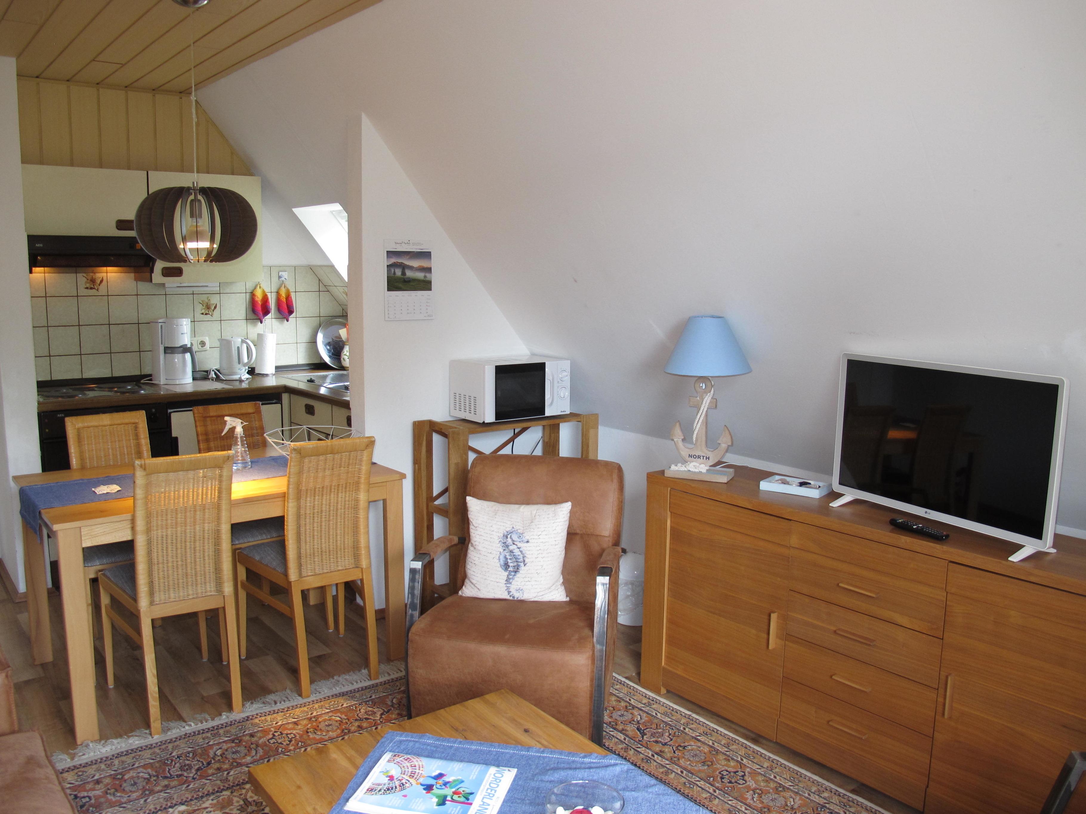 Zugang übers Treppenhaus in die 1. Etage. Separater Zugang in Flur mit Garderobe. Wohnraum mit Sitzgruppe, Eßplatz und einer offenen Küche mit Einbauherd (4 Platten, Backofen), Mikrowelle, Kaffeemaschine, Wasserkocher, Toaster und Kühlschrank. 2x Doppelzimmer. In 2024 umfassend renovierte Dusche/WC. NICHTRAUCHEROBJEKT.
