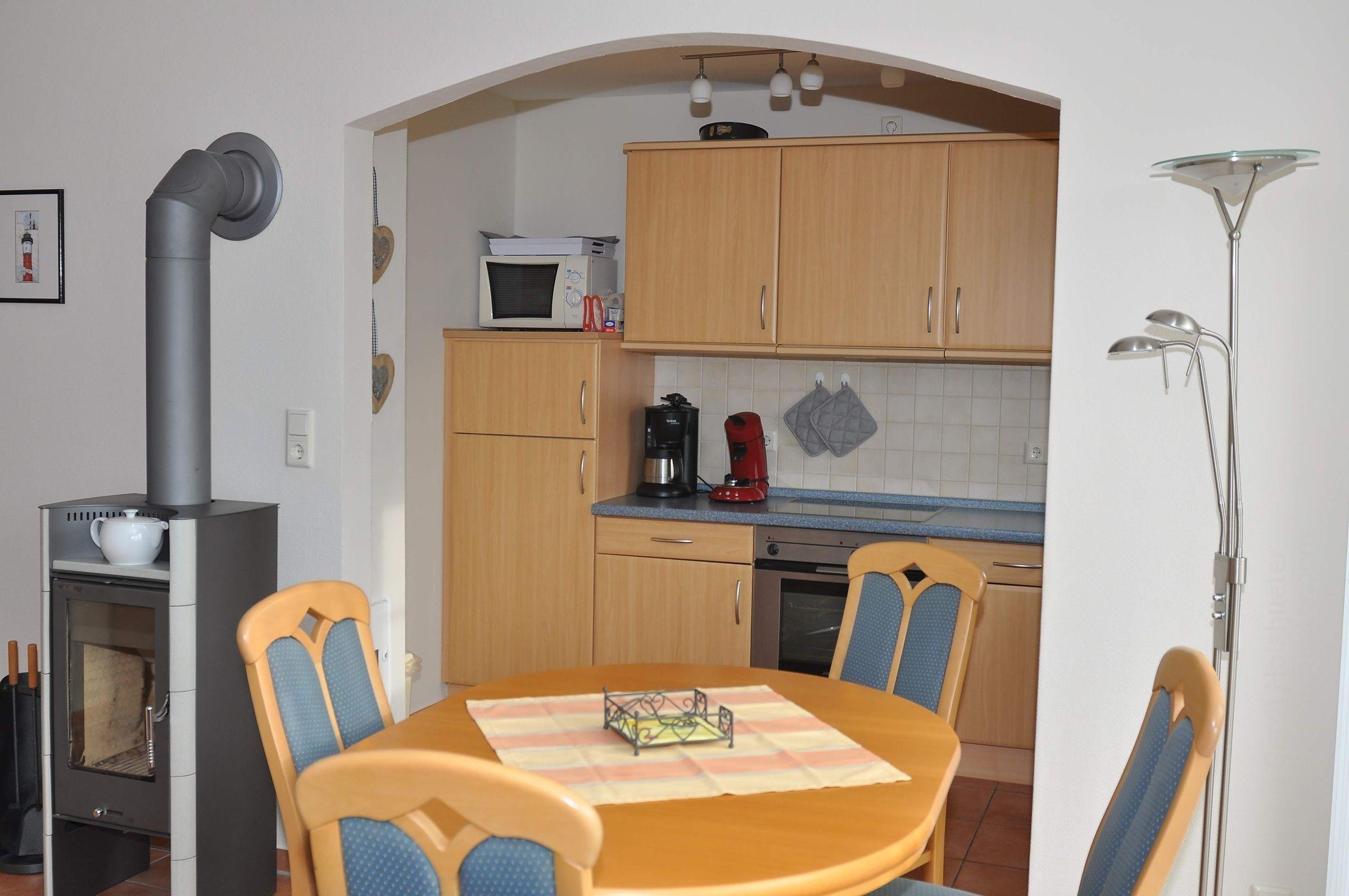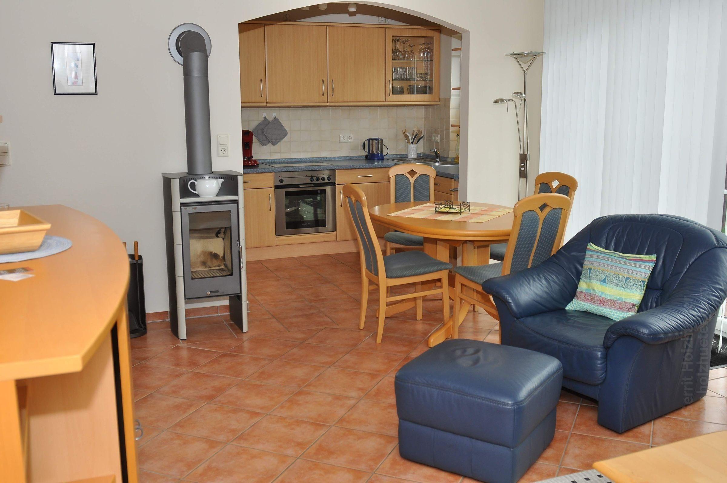 Die Ferienwohnung bietet ein ideales Zuhause für erholsame Tage. Mit zwei geschmackvoll eingerichteten Schlafzimmern, die jeweils mit einem Doppelbett ausgestattet sind, und zwei modernen Badezimmern, eignet sie sich hervorragend für Familien oder Gruppen. Die offene Küche ist ein wahres Highlight und bietet eine Fülle an Annehmlichkeiten, darunter einen Geschirrspüler, Elektro- und Gasherd, Backofen, Mikrowelle sowie eine Kaffeemaschine und Espressomaschine. Ein gemütlicher Esstisch lädt zum gemeinsamen Speisen ein. Der Wohnbereich besticht durch einen Kamin oder Kachelofen, ein Sofa, einen Sessel und eine HiFi-Anlage. Für praktische Annehmlichkeiten sorgen WLAN, Waschmaschine, Wäschetrockner und ausreichend Stauraum mit Schrank und Kommode. Zudem sind die Räume allergikergeeignet und es steht ein Parkplatz zur Verfügung. Fahrräder können ebenfalls genutzt werden, um die Umgebung zu erkunden.