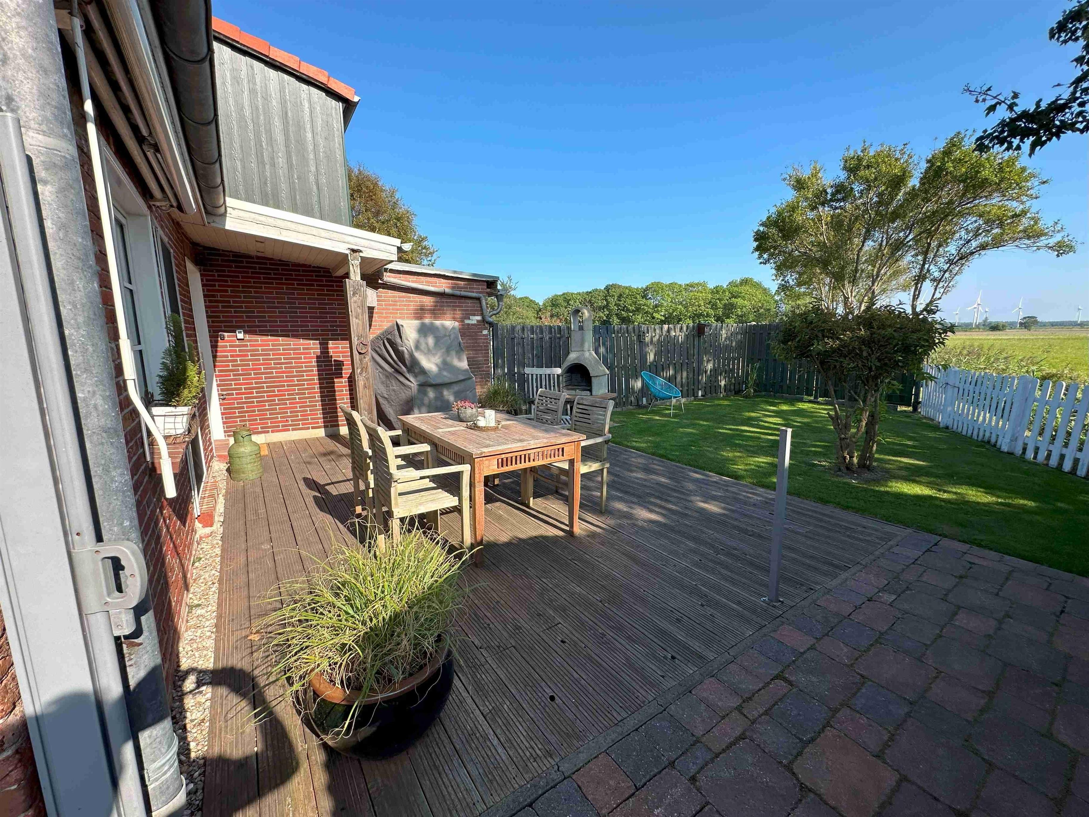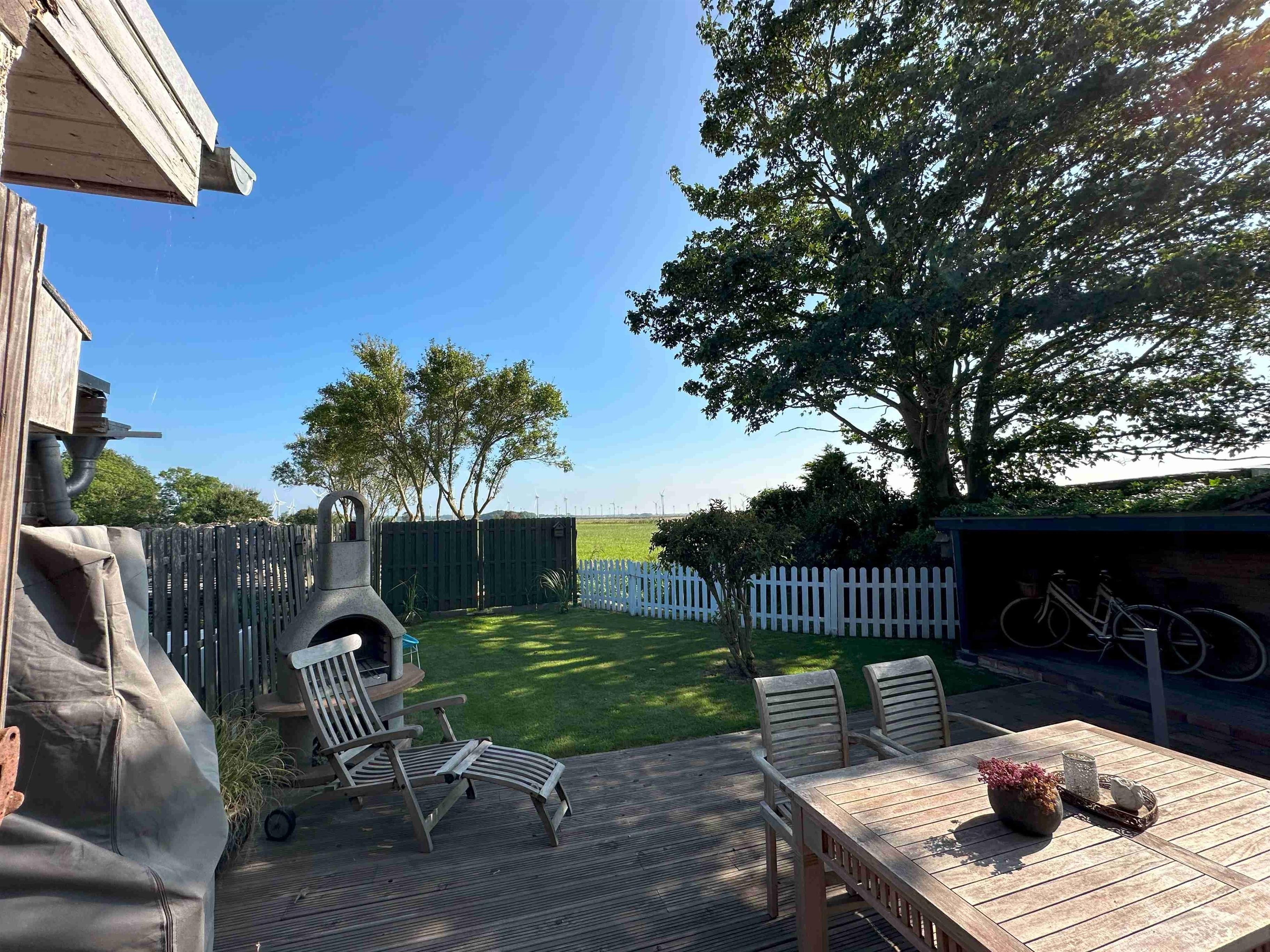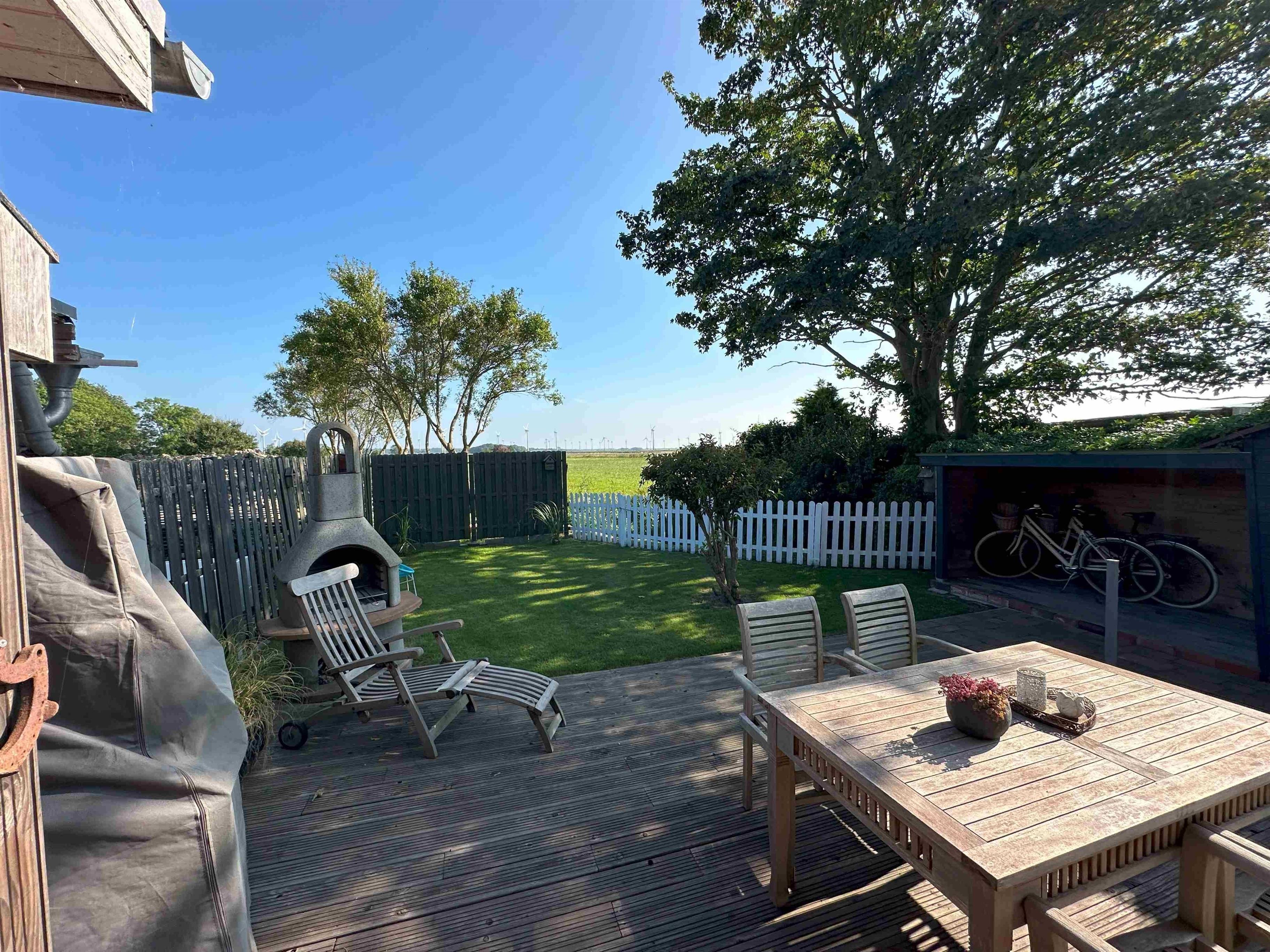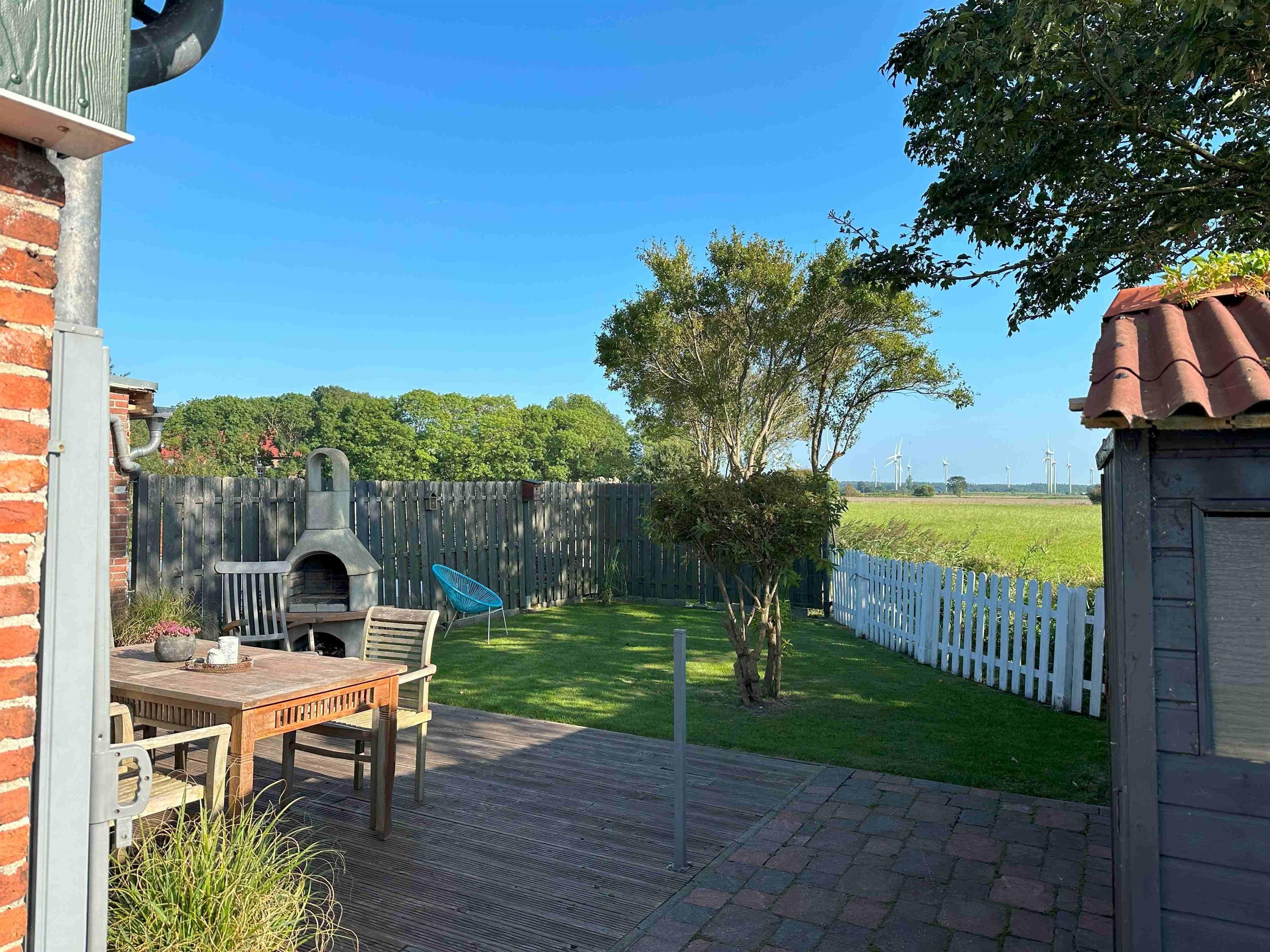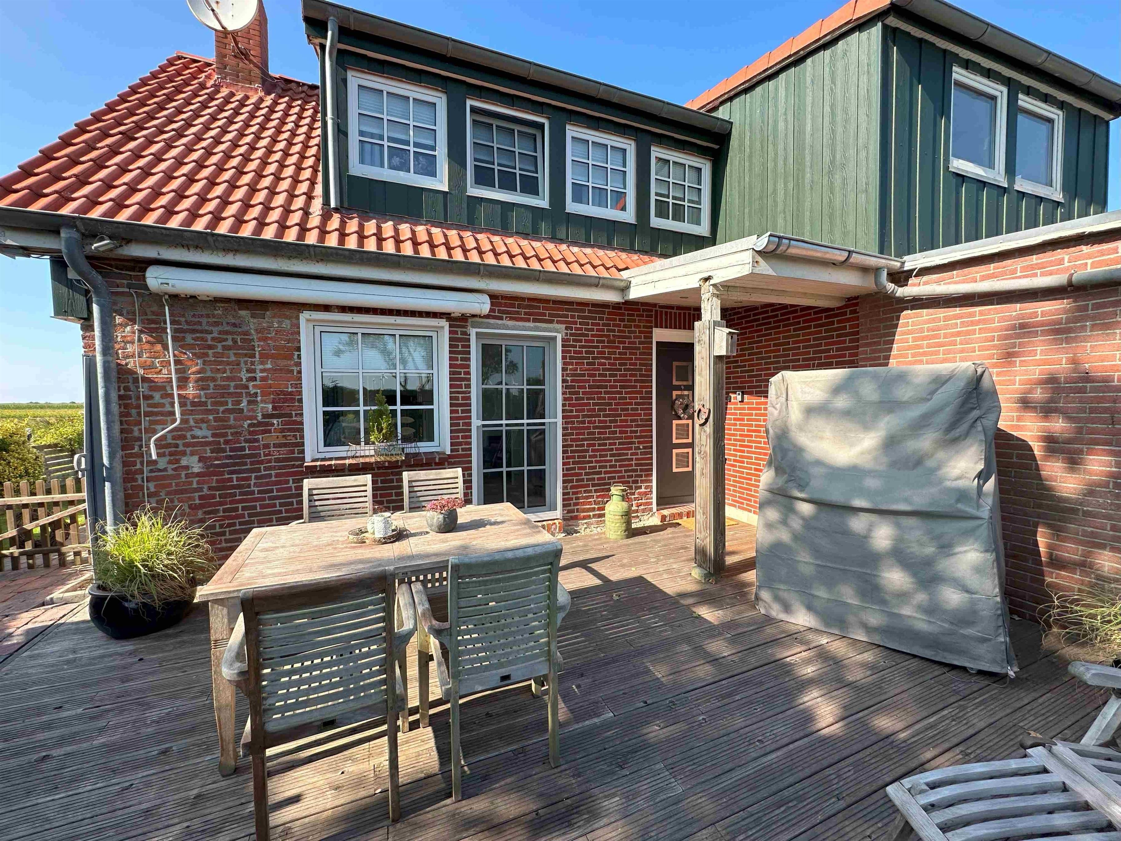 Ferienhaus "Huus an`t Diek" in Norden/Ostermarsch . Bei dem Ferienhaus handelt sich um eine Doppelhaushälfte über zwei Etagen mit Garten, Parkplatz, Wohn und Schlafzimmer, eine voll ausgestatte Küche, Holzterrasse, Strandkorb , Gartenmöbel und Grill.