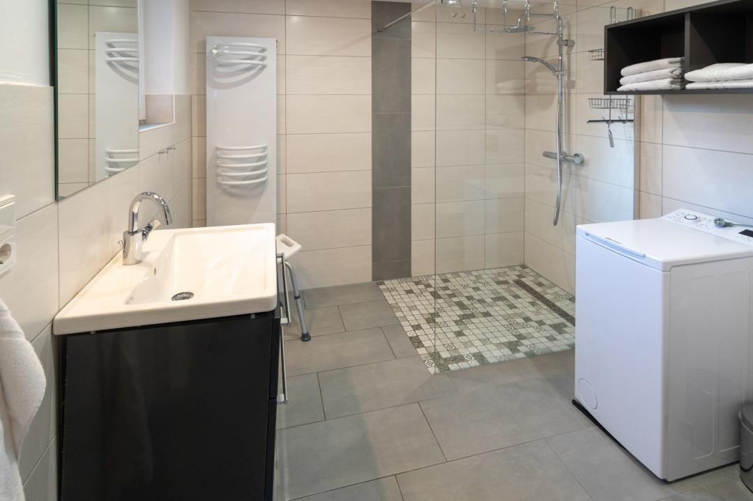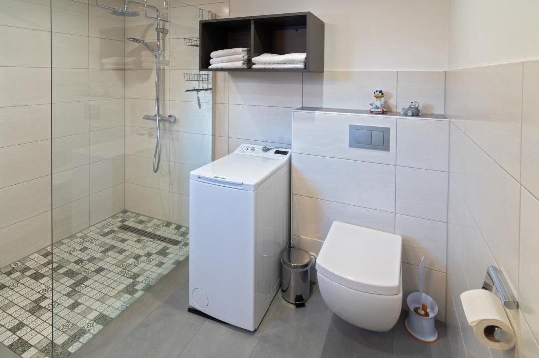 Dieses Schlafzimmer ist ein Durchgangszimmer, das im Duschbad mit Regendusche, Toilette, Waschbecken und Waschmaschine endet.