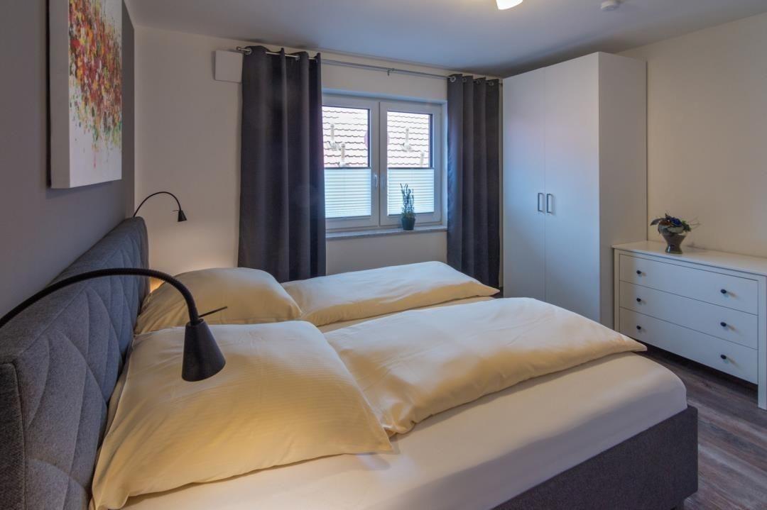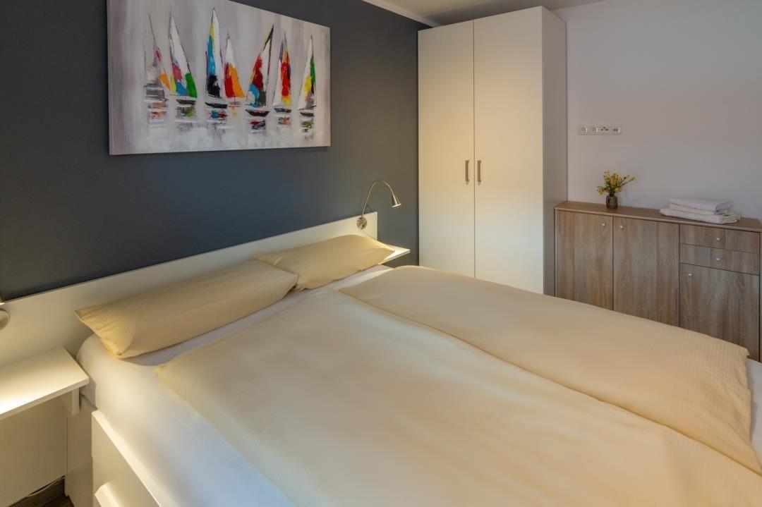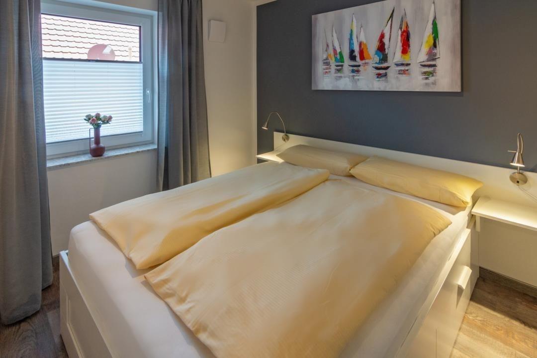 Die Ferienwohnung ist mit seinen beiden Schlafzimmern ideal für vier Personen. Beide Schlafräume bieten ein Doppelbett (eines mit einer Größe von 180 x 200 cm, das andere mit 140 x 200 cm), Nachttische sowie jeweils einen geräumigen Kleiderschrank. Weiteren Stauraum, zum Beispiel für Strandutensilien, finden Sie in dem kleinen zugehörigen Abstellraum.